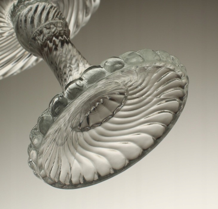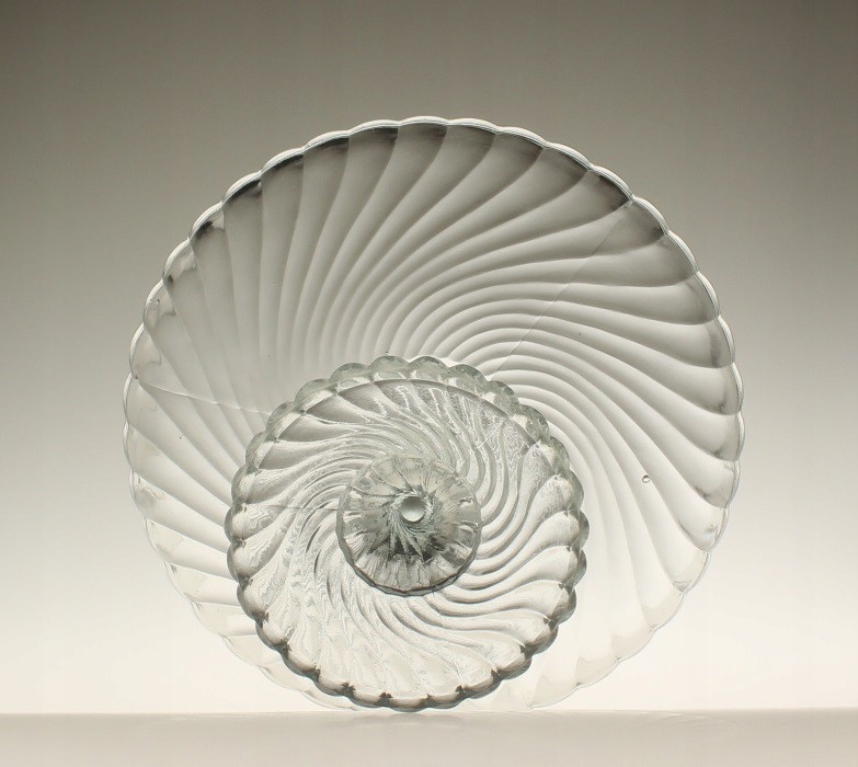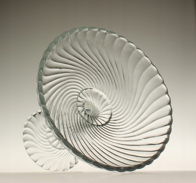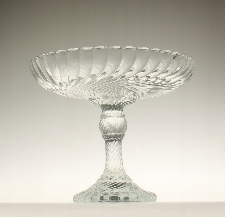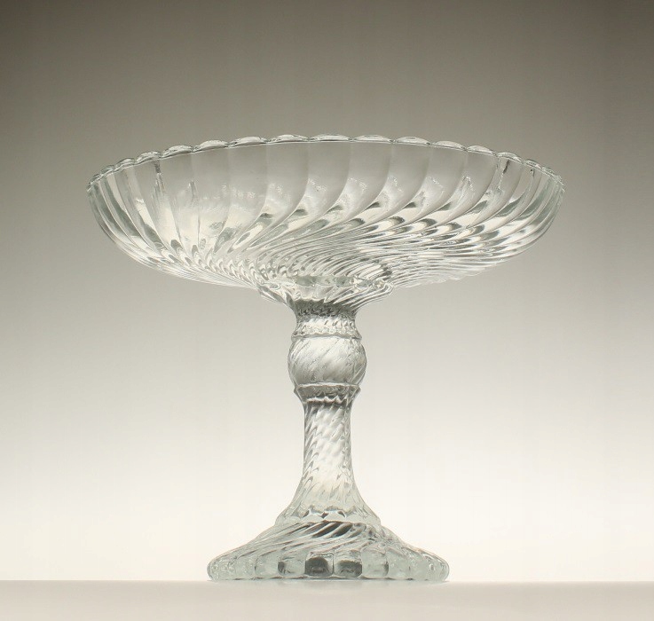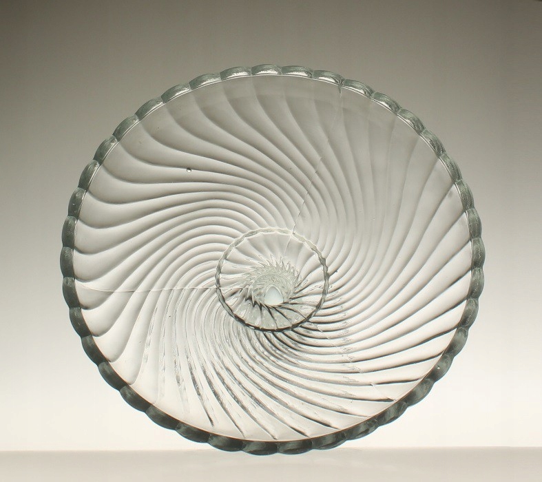 Фруктовая тарелка из бесцветного прессованного стекла. Произведено на отечественном стекольном заводе «Зомбковице» в Домбровой Гурнице. Дизайн Рышарда Сервицкого. Серия «Вир»/«Спирелли»/«Твист». 1970-е годы