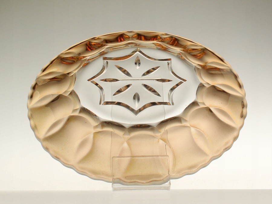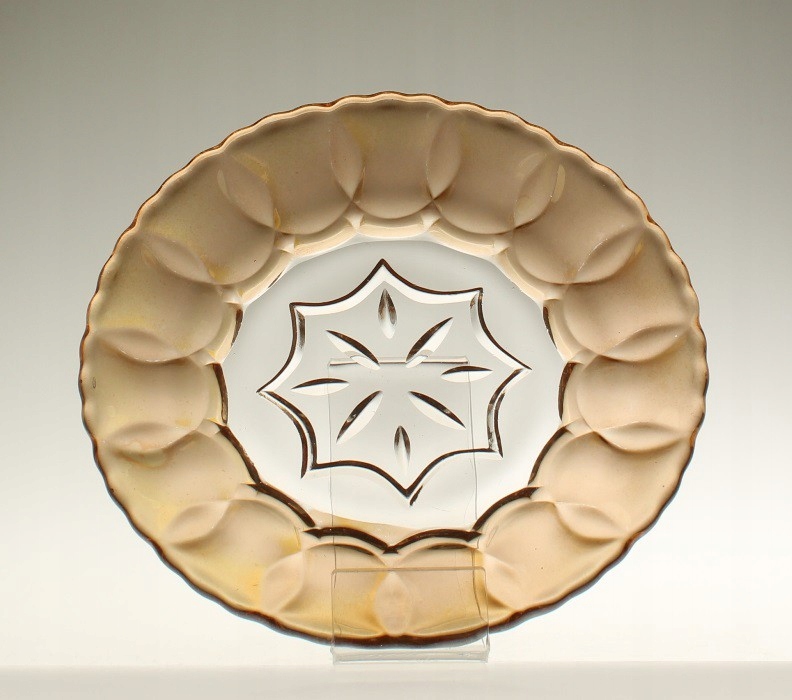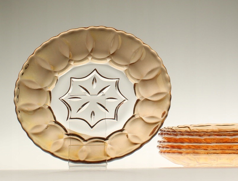 Шесть десертных тарелок из прессованного стекла. Воротники украшены переливающимся покрытием с нижней стороны. Тарелки производятся на отечественном стекольном заводе «Зомбковице» в Домбровой Гурнице. Довоенная модель.