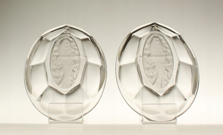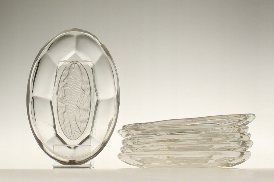 Шесть маленьких держателей для селедки из бесцветного прессованного стекла с рельефным рыбным мотивом на дне. Они производятся на отечественном стекольном заводе «Зомбковице» в Домбровой Гурнице. Каталожный номер 1224/И.