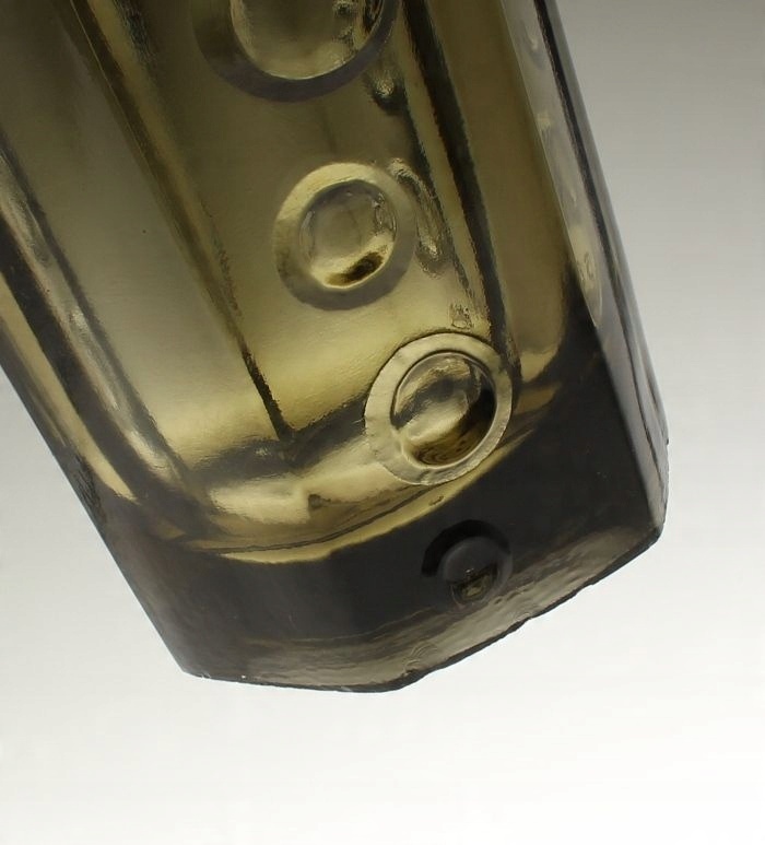 Внутри, примерно на 2,5 см ниже края заливной горловины, имеются неровные потеки осадка. Край заливной горловины и края выступов на брюшке ровные, без каких-либо шероховатостей и дефектов. По краю основания имеются незначительные шероховатости и несколько мелких микровмятин, а на одной из стенок днища, на стыке с краем основания, имеются два плоских скола ок 3 и 2 мм. мм. Внизу брюха имеется крупная стеклянная стружка.