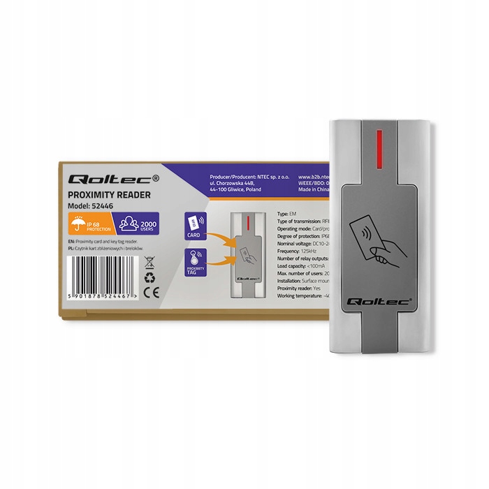 Проксимити-считыватель Qoltec позволяет запрограммировать до 2000 пользователей. Устройство имеет встроенный светодиод и звуковой сигнал. После считывания карты о корректной работе сигнализирует зеленый светодиод и один звуковой сигнал. После 10 неудачных попыток доступа в течение одной минуты блокировка сработает и считыватель автоматически заблокируется на срок 10 минут.