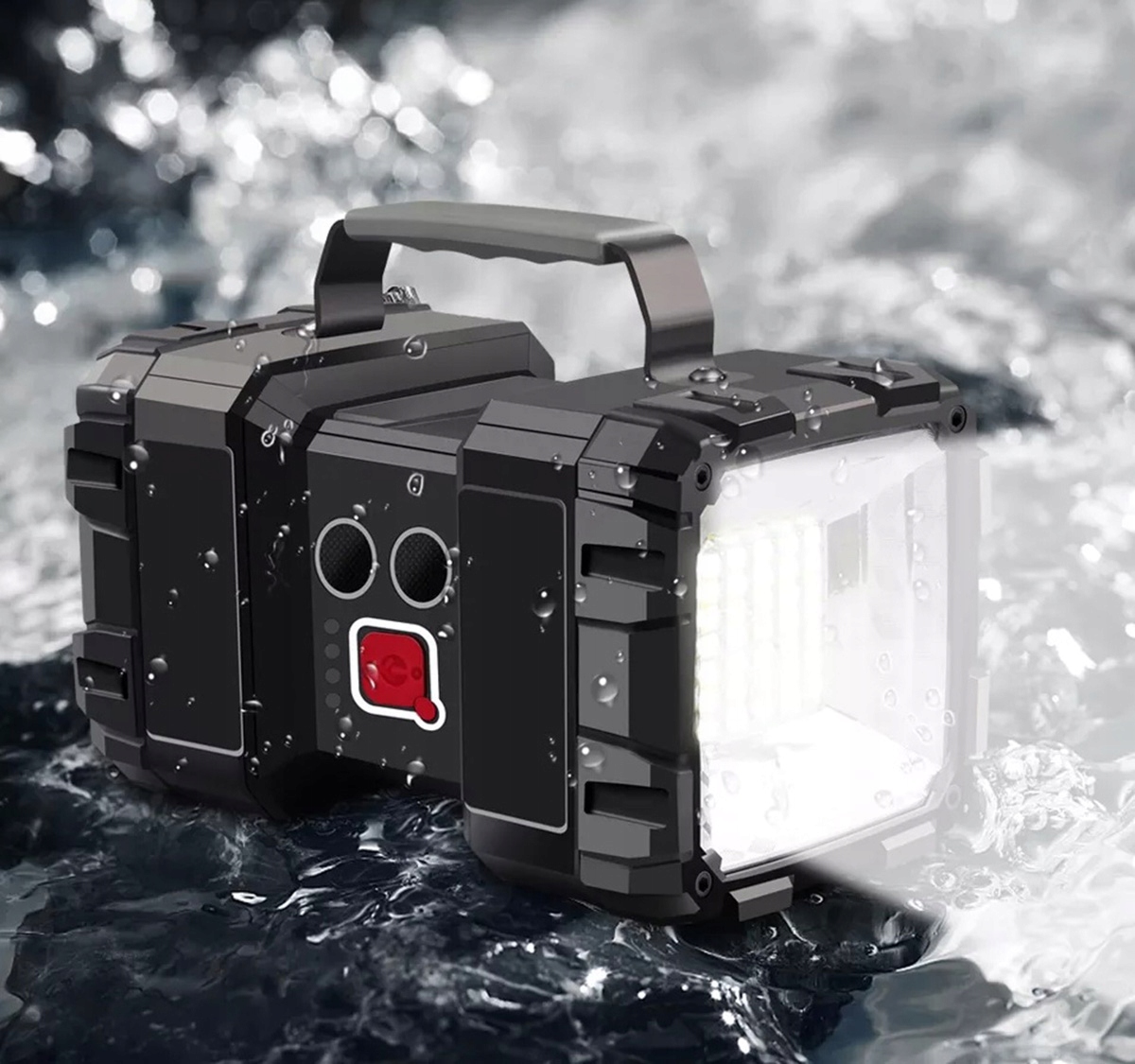 - Прожектор водонепроницаем и ударопрочен. Прорезиненный переключатель и гнездо для зарядки, а также уплотнительные кольца защищают фонарь от пыли и влаги. Чрезвычайно прочный!