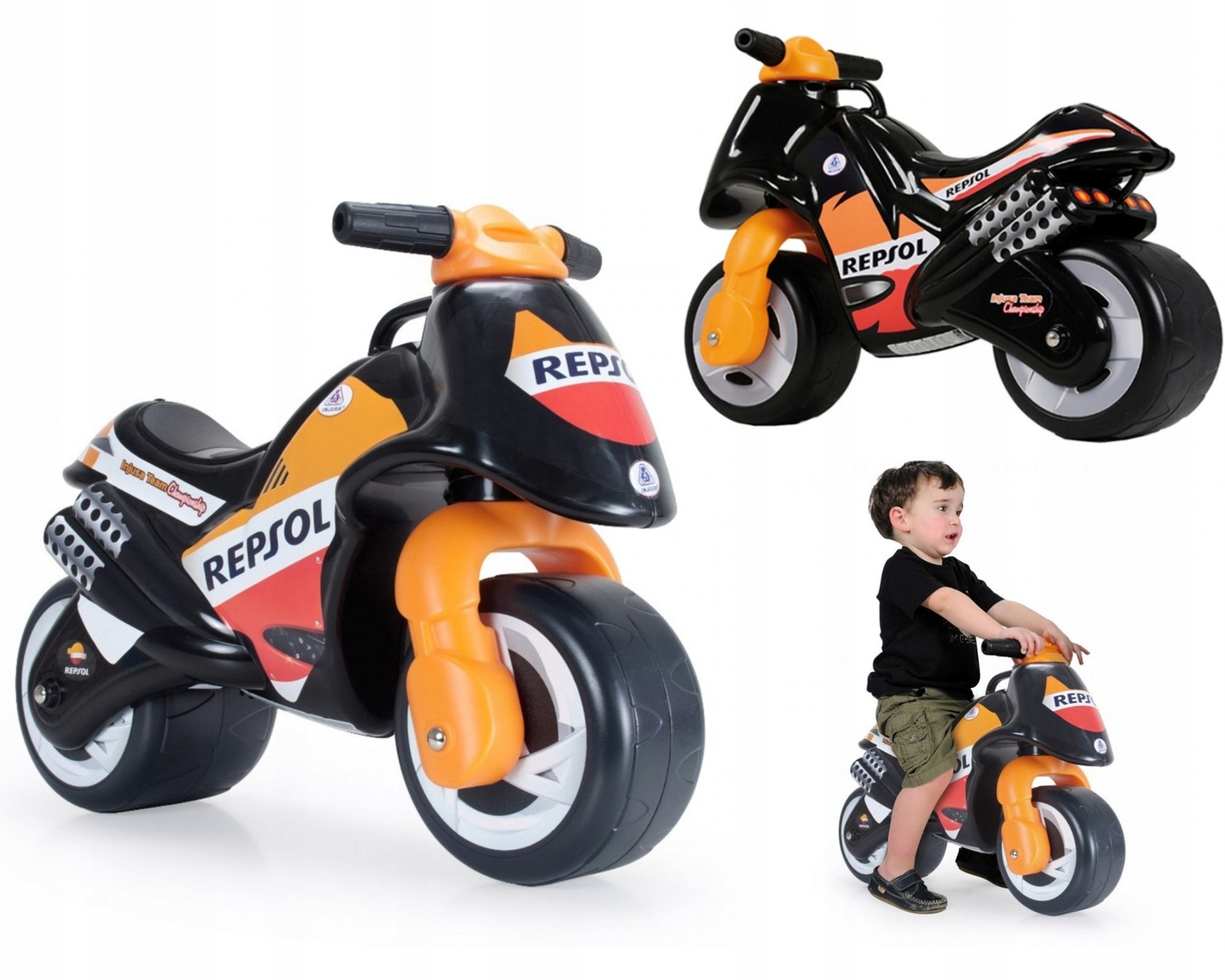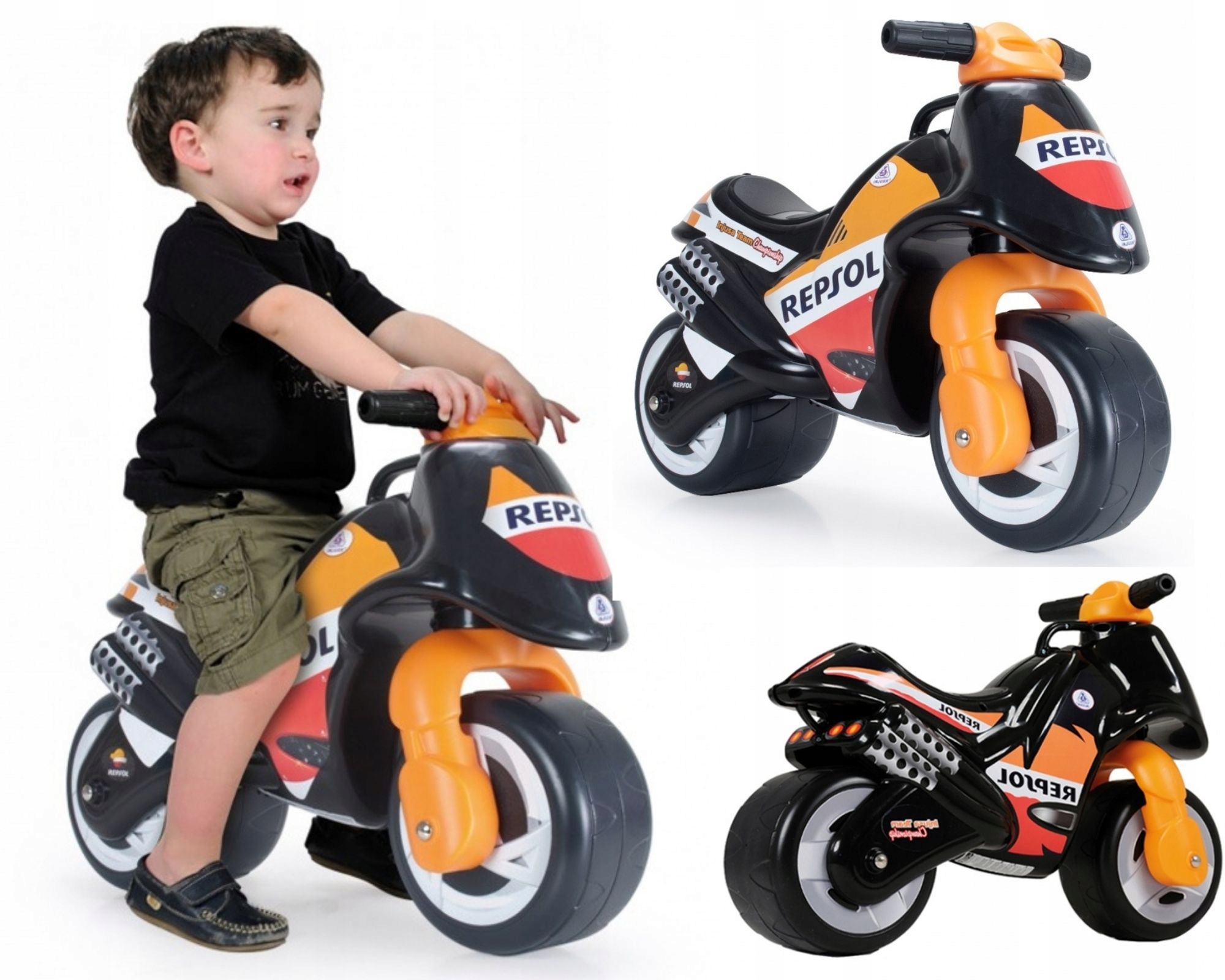 - Каталог с логотип Repsol имеет удобный руль, широкие колеса , облегчающие удержание равновесия, и поворотное переднее колесо.