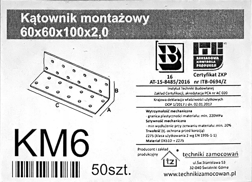 З'єднувач Ciesielski Angle KM6 60x60x100x2,0 50sz