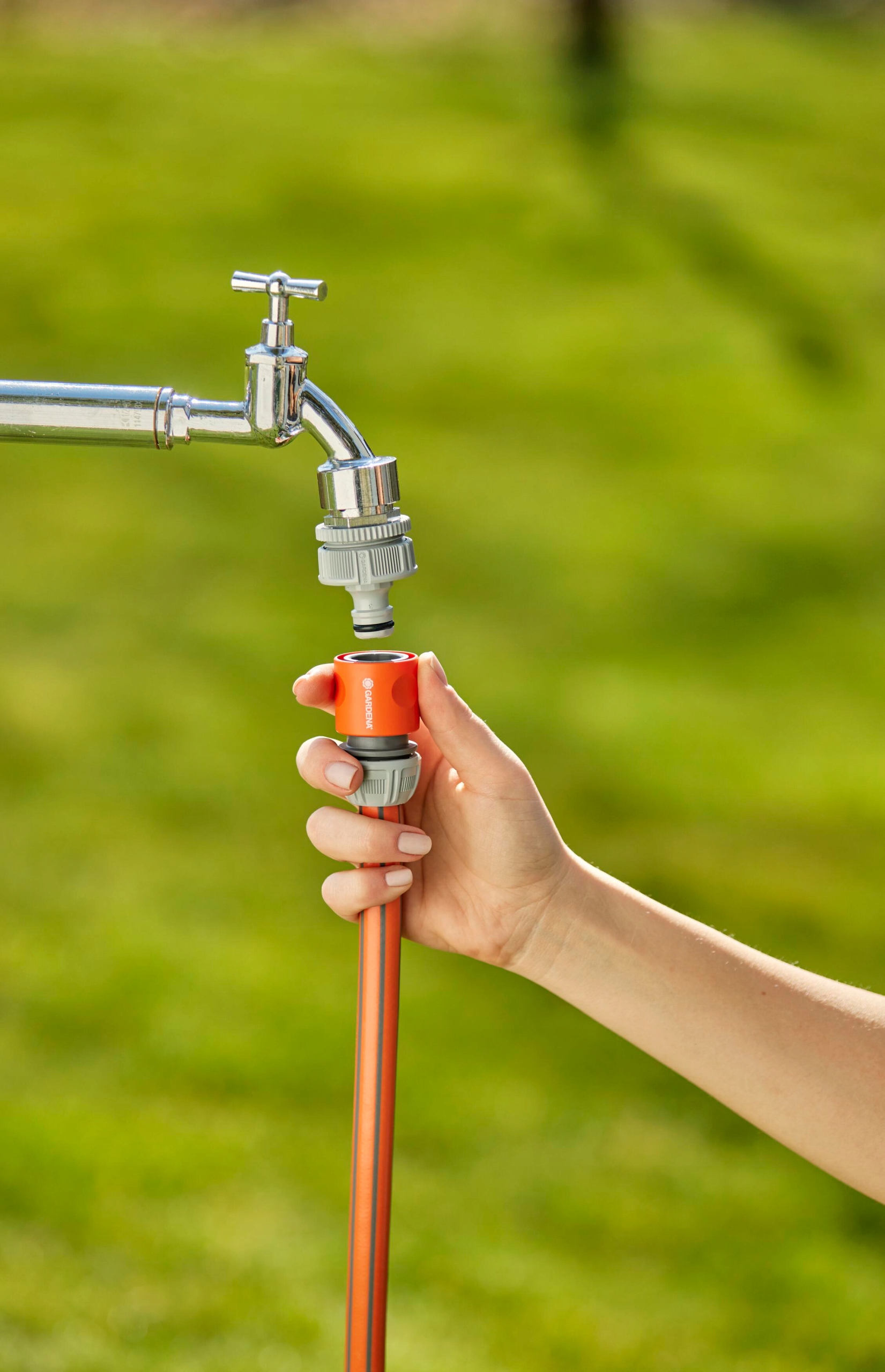 Надежное соединение крана для надежного соединения садового шланга с краном.Соединение крана GARDENA 26,5 мм надежно соединяет шланг с краном. Пользователи оценят практичную функцию Anti-Splash, благодаря которой струя фокусируется и вода не разбрызгивается при наливании. Эксплуатация удобна и проста благодаря особой форме соединения.