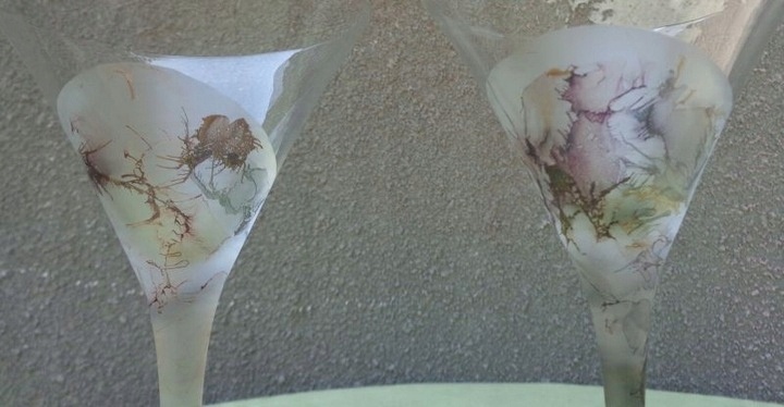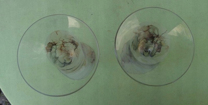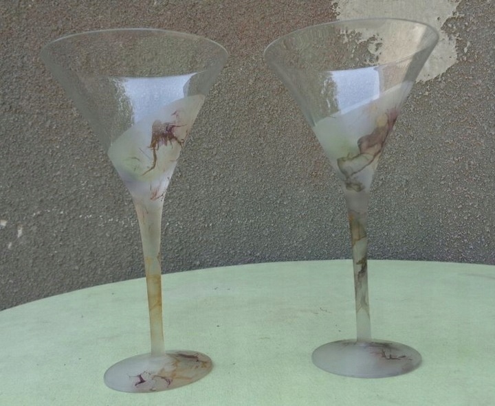 Интересные, интересные, богато украшенные две рюмки. Экспонаты имеют плоское основание, которое интересно декорировано. У очков длинная горловина, которая тоже интересно декорирована. Чаша экспонатов имеет чашеобразную форму. Он был украшен интересным пятнистым орнаментом. Стекло не имеет повреждений. Бокалы элегантно смотрятся на каждом столе. Всем рекомендую.