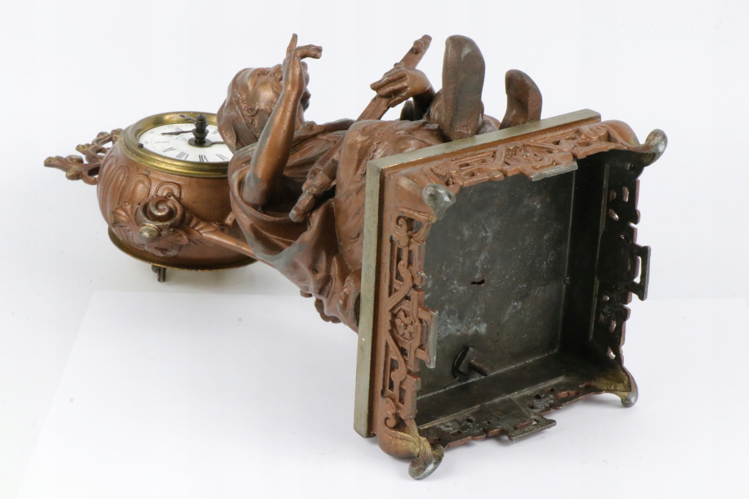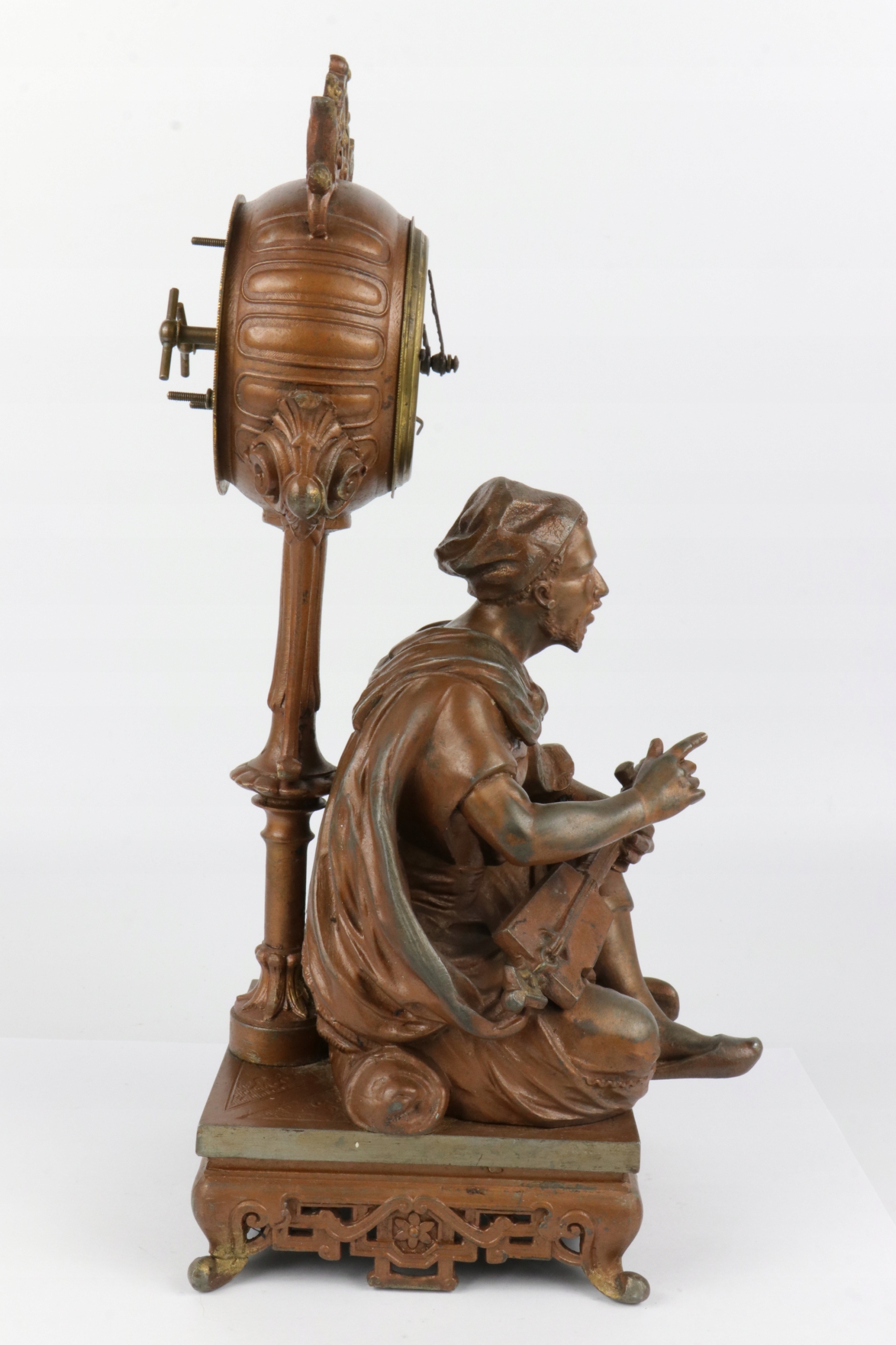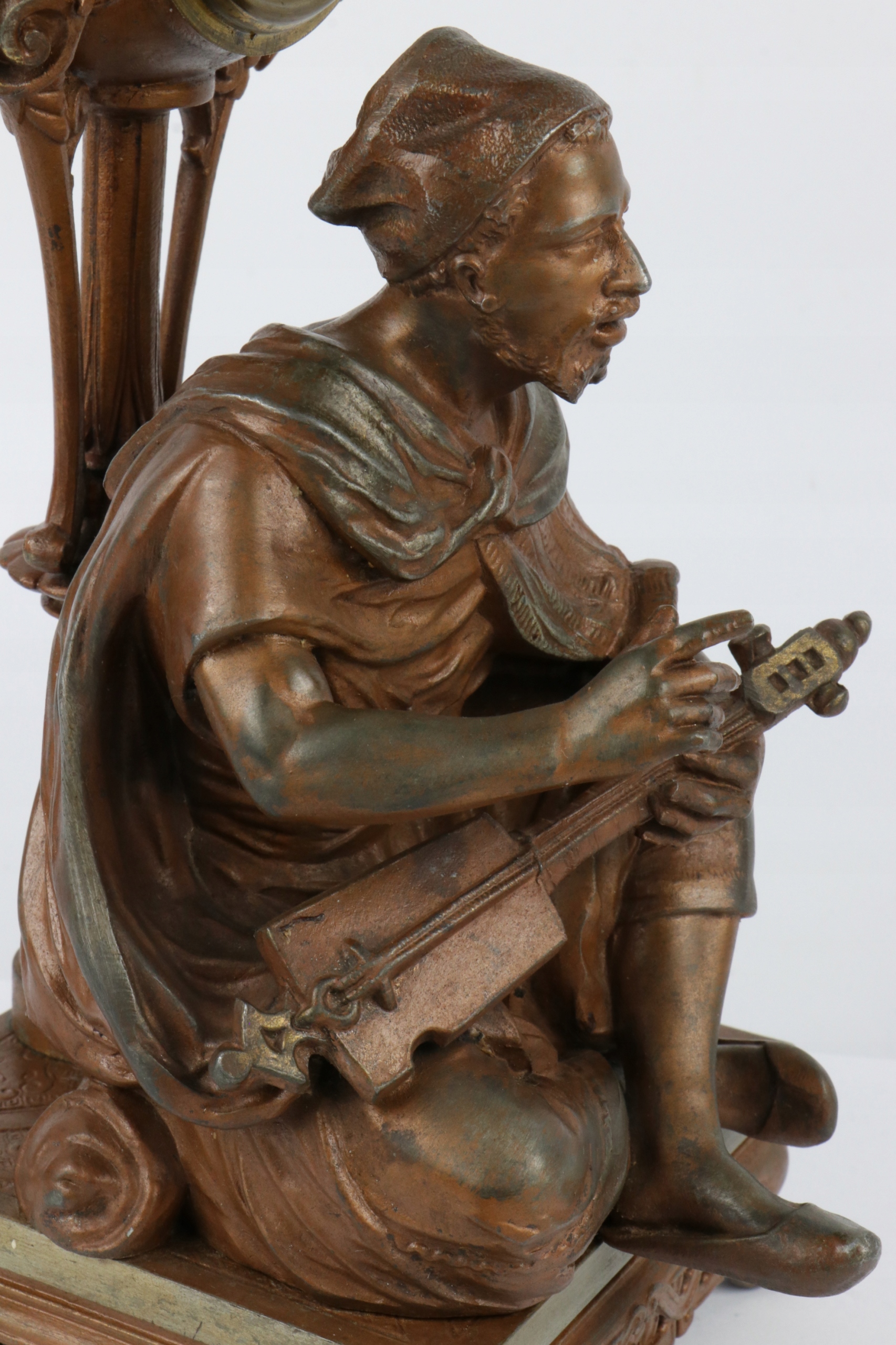 Интересный будильник, украшенный фигуркой сарацина, играющего на музыкальном инструменте. Часы на тонкой колонне.