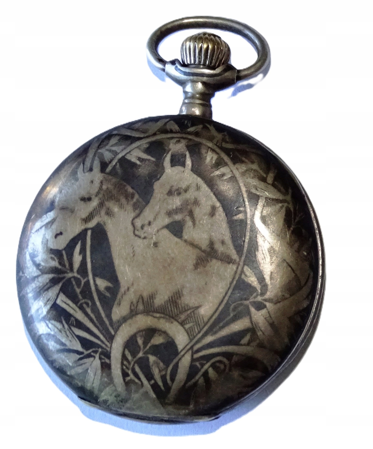 Zegarek kieszonkowy Hippika Konie Koń Jeździectwo Koniarstwo, niello srebro