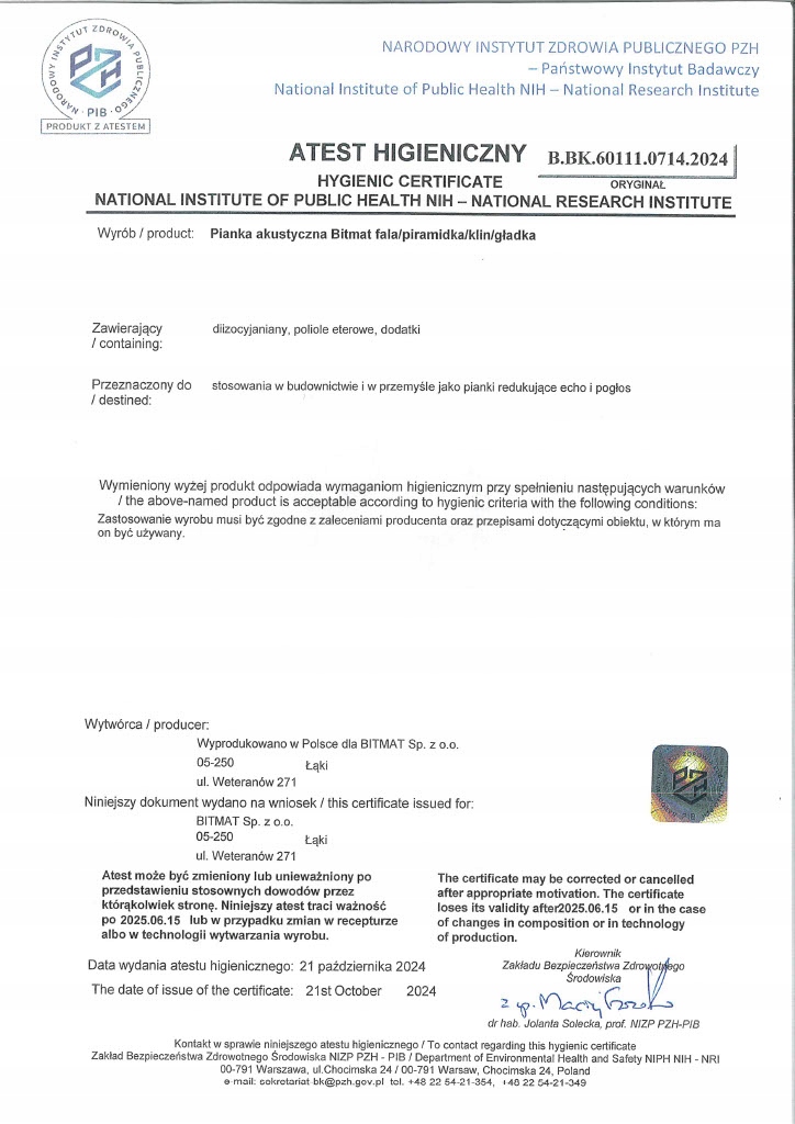 Акустические панели Bitmat Equalizer – польский продукт, разработанный специалистами в области акустики, обеспечивший высокую эффективность снижения реверберации и эстетичный внешний вид панелей. Благодаря сертификатам, подтверждающим безопасность и эффективность, вы можете быть уверены, что выбираете панели, которые не только эффективны, но и полностью безопасны для вас и ваших близких.