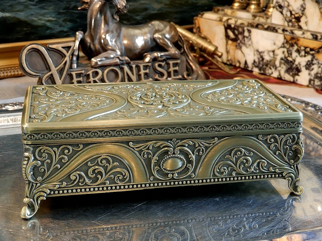 Шкатулка изготовлена из цинкового сплава, покрыта латунью. Производитель называет этот цвет зеленой латунью. Красивая, необычная вещь.