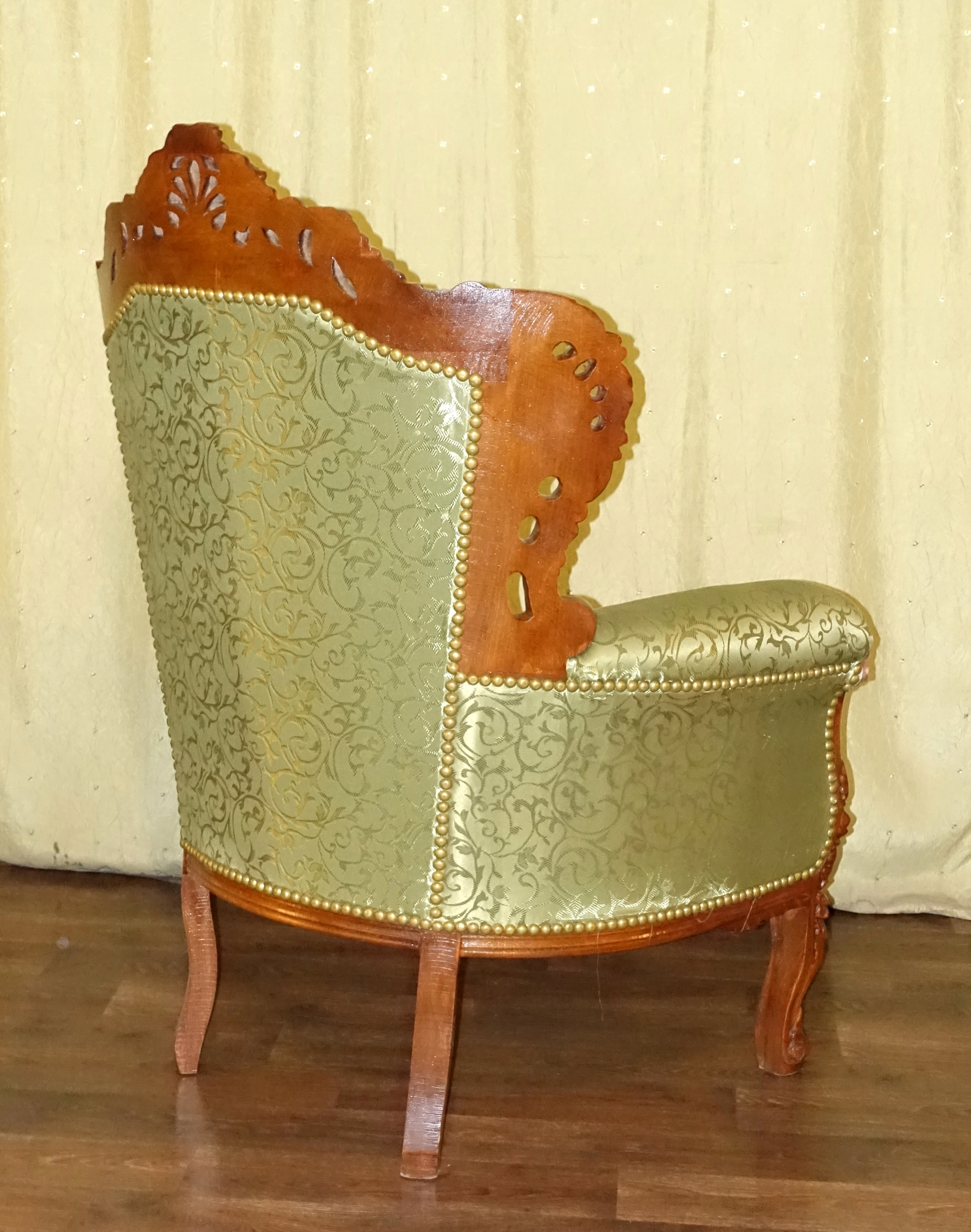 Деревянная конструкция, как и подобает этому стилю, богато украшена резьбой из темного ореха. Зеленая обивка с тонкими растительными узорами. Спинка со вкусом простегана, все эстетично отделано булавкой - состояние очень хорошее.