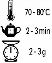 1 чайная ложка чая на чашку настоя (160 мл), заваривается при температуре примерно 75-80С в течение примерно 2-3 минут. Для получения стакана напитка используйте 1,5 чайные ложки травы. Как и для всех зеленых чаев, для этой смеси необходимо строго соблюдать температуру и время заваривания, поскольку более высокая температура и более длительное время заваривания приводят к высвобождению большего количества теинов и изменяют вкус чая, а также его свойства. Напоминаем, что лучший настой получается при второй и последующих заварках этого чая, в ходе которых мы рекомендуем вам самостоятельно и внимательно экспериментировать со временем и температурой заваривания.