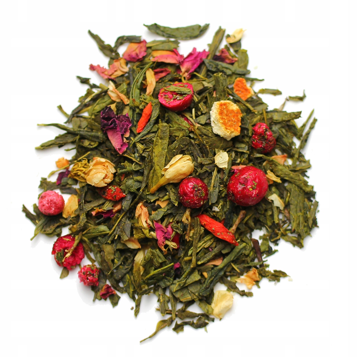 Состав чая: зеленый чай Сенча, сушеные ягоды годжи, кокосовая стружка, сушеная апельсиновая цедра, ароматизатор, лепестки розы, красная смородина сублимированная, лепестки жасмина, сублимированная клюква.