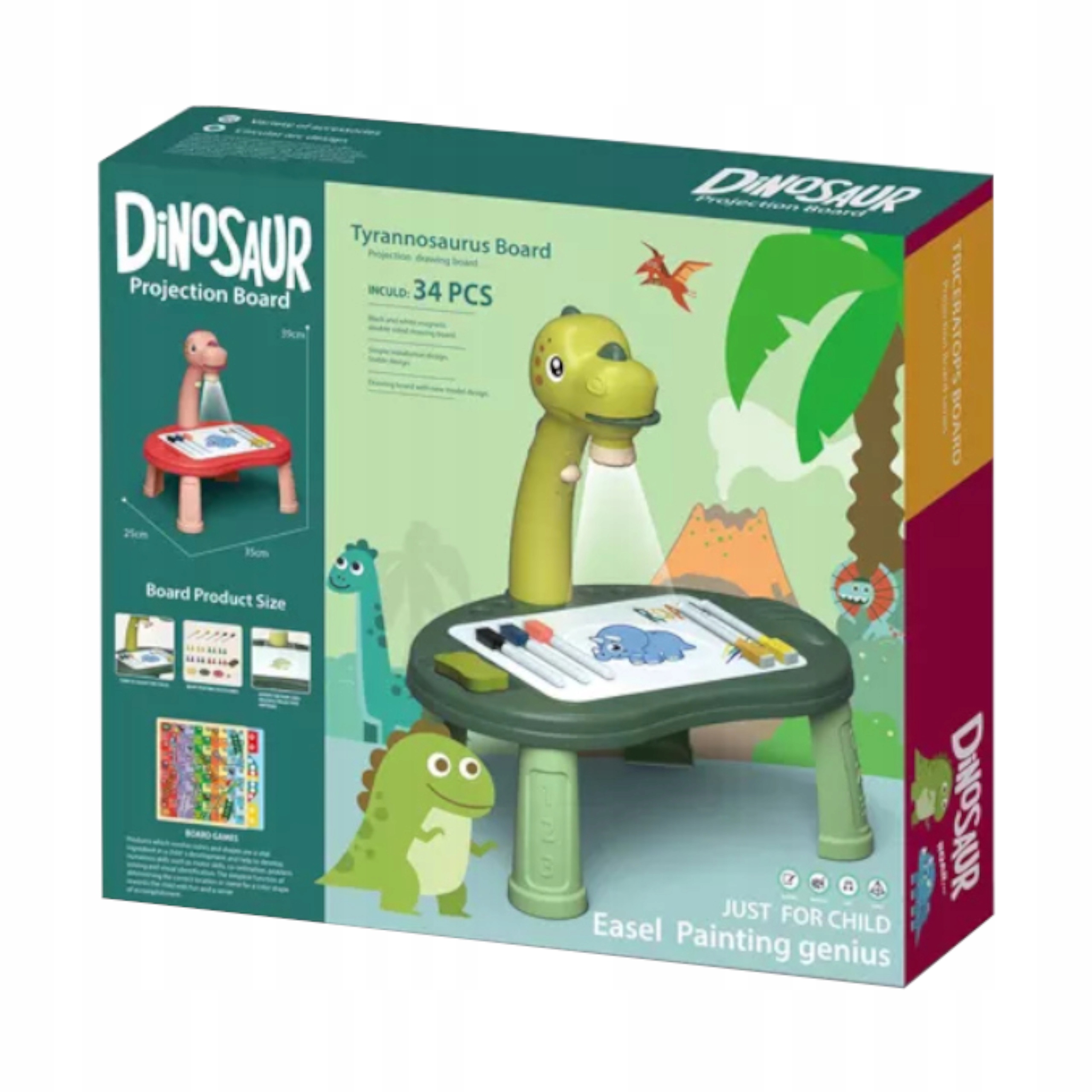 - Проектор для рисования динозавра Ти-рекса, стол, китайская игра. Проектор для обучения рисованию и живописи. отличный способ для вашего ребенка учиться через игру. С раннего возраста он стимулирует воображение, тренирует наблюдательность и память. Развивающая игрушка, которая будет развивать художественные способности вашего ребенка, что приведет к дальнейшему обучению в детском саду, а затем и в школе. Проектор в приятных оттенках зеленого станет прекрасным подарком для любого ребенка, который любит рисовать. Ребенок будет заинтересован и готов играть долгие часы, а 3 сменных диска для рисования, входящие в комплект, позволят ему создавать красивые рисунки! Особенности продукта: ✅ Проектор можно использовать как стол, поскольку у него 4 ножки с подставкой. ✅ В проекторе есть 3 диска с тематическими рисунками, благодаря которым ребенок изучает формы, цвета и названия динозавров, транспортных средств и фруктов и овощи. ✅ Яркие цвета проектора в оттенках зелени, что привлекает внимание ребенка и побуждает его играть. ✅ Всего в нем имеется целых 24 рисунка для рисования, которые обеспечивают долгие часы отличного удовольствия, поэтому родители могут рассчитывать на некоторое время для ✅ В комплект входят 2 настольные игры, в которые можно играть всей семьей. ✅ Проектор. Он также может работать как ночник, с которым ребенок может спокойно заснуть. ✅ Проектор для рисования можно взять с собой в сад или на прогулку. ресторане, поэтому ваш ребенок будет веселиться, куда бы вы ни пошли. ✅Игрушка упакована в красивую красочную коробку, поэтому отлично подойдет для подарка. Спецификация Возраст: 3+ Цвет: зеленый Размеры проектора: 37 см x 34 см x 22 см Диаметр диска: 6 см Размеры рисующей поверхности: 22 x 15,5 см Высота рисуемой поверхности: 14 см Длина маркера: 11,5 см Размеры губки: 7 x 4 см Размеры игрового поля: 22 х 20,5 см. Размеры игровой фигуры: 1,2 х 1 см. Размеры кубика: 0,7 х 0,7 см. Размеры упаковки: 36 х 25,5 х 10,5 см. Батарейки: 3 х АА (в комплект не входят). Игрушка сертифицирована CE, EN71. Детский проектор для рисования в форме динозавра Ти-рекса. Создание рисунков с помощью проектора для рисования стимулирует воображение маленького художника, который изливает свои художественные идеи на лист бумаги. Держа в руках мелок или маркер с раннего возраста, дети тренируют ловкость рук, координацию движений и навыки восприятия. Как мы знаем, в наше время дети быстро отвлекаются, и, копируя положения проектора для обучения рисованию, ребенок учится концентрации и сосредоточенности. Рисование дает многим детям покой, что позволяет им выпустить свои эмоции и успокоиться, давая родителям. момент передышки. Для еще большего эффекта от рисунков проектор был спроектирован таким образом, чтобы можно было регулировать резкость отображаемого изображения. Игрушка поможет хорошо провести время всей семьей, ведь каждый член сможет попробовать свой талант в рисовании и кальке. Проектор для обучения рисованию на доскеВсе дети любят рисовать. Этот проектор позволяет создавать красивые изображения с помощью света! Стимулирование вашего воображения — это не просто воспроизведение слайда с изображением. Вы можете рисовать собственных персонажей и фоны, благодаря чему вы сможете создавать красивые художественные произведения. В комплект поставки проектора для обучения р