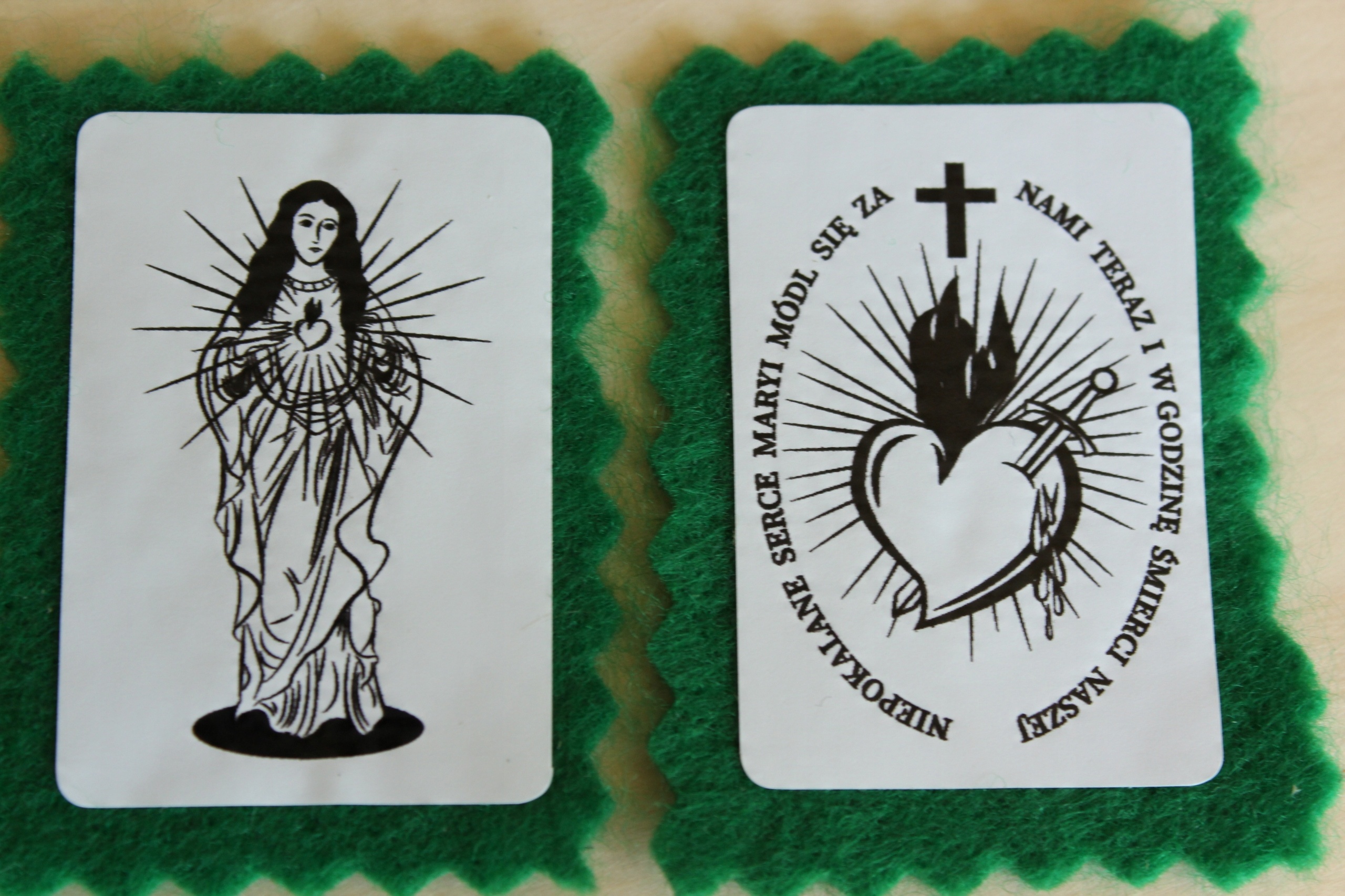 На одной стороне материала располагалась фигура Непорочной Девы, указывающая на Свое Сердце, а на другой — Сердце, пронзенное мечом, окруженное надписью: "Непорочное Сердце Марии, молись о нас ныне и в час нашей смерти."