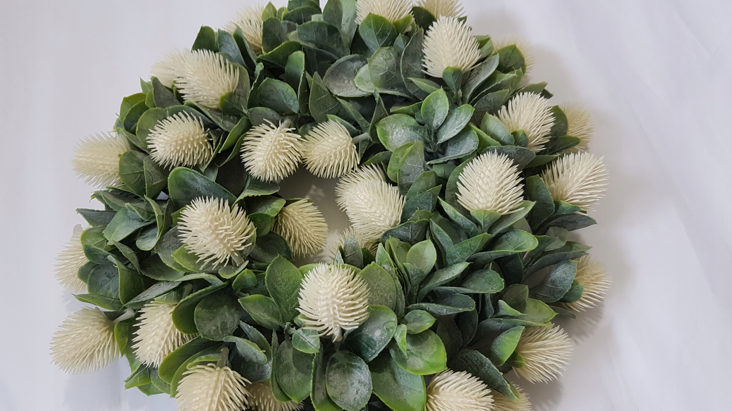 Предмет продажи - зеленый искусственный венок с чертополохом,