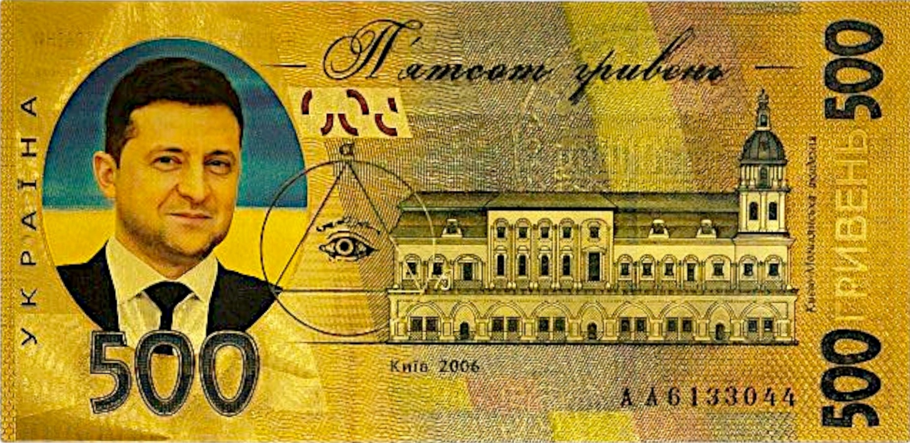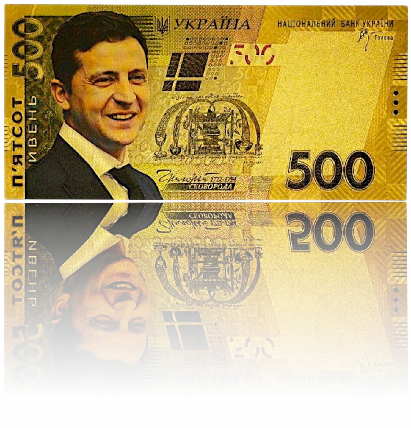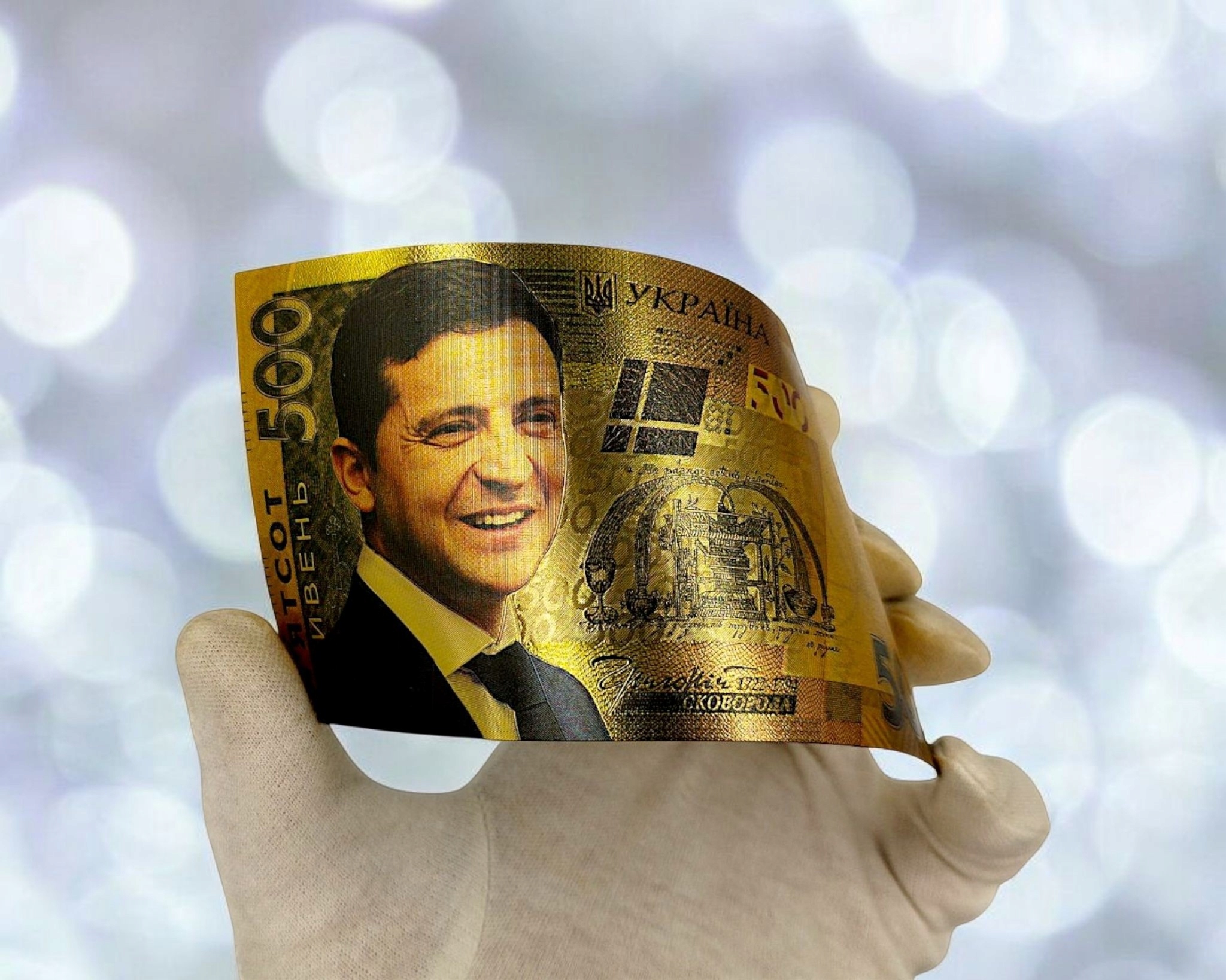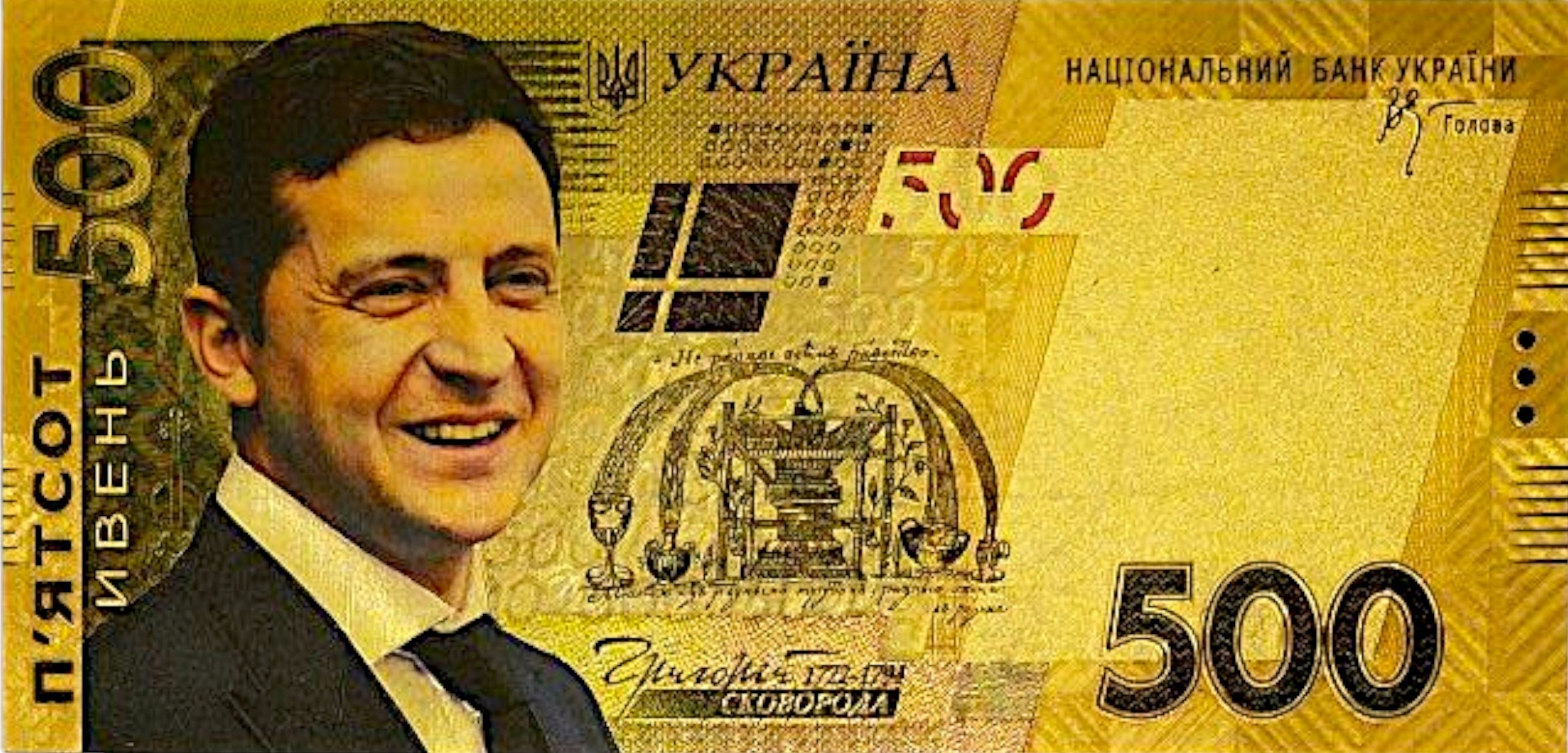 ВЛАДИМИР ЗЕЛЕНСКИЙ Позолоченная коллекционная банкнота из ПВХ номиналом 500 гривен.