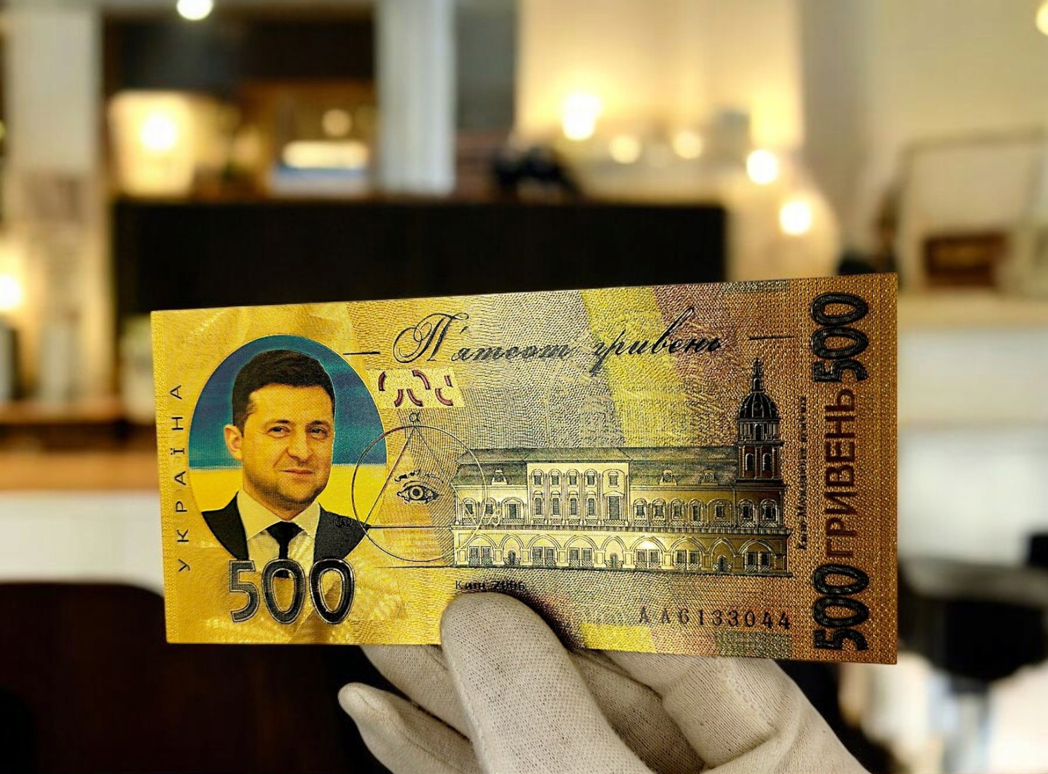 ВЛАДИМИР ЗЕЛЕНСКИЙ ПОЗОЛОЧЕННАЯ КОЛЛЕКЦИОННАЯ БАНКНОТА ПВХ 500 ГРИВИН