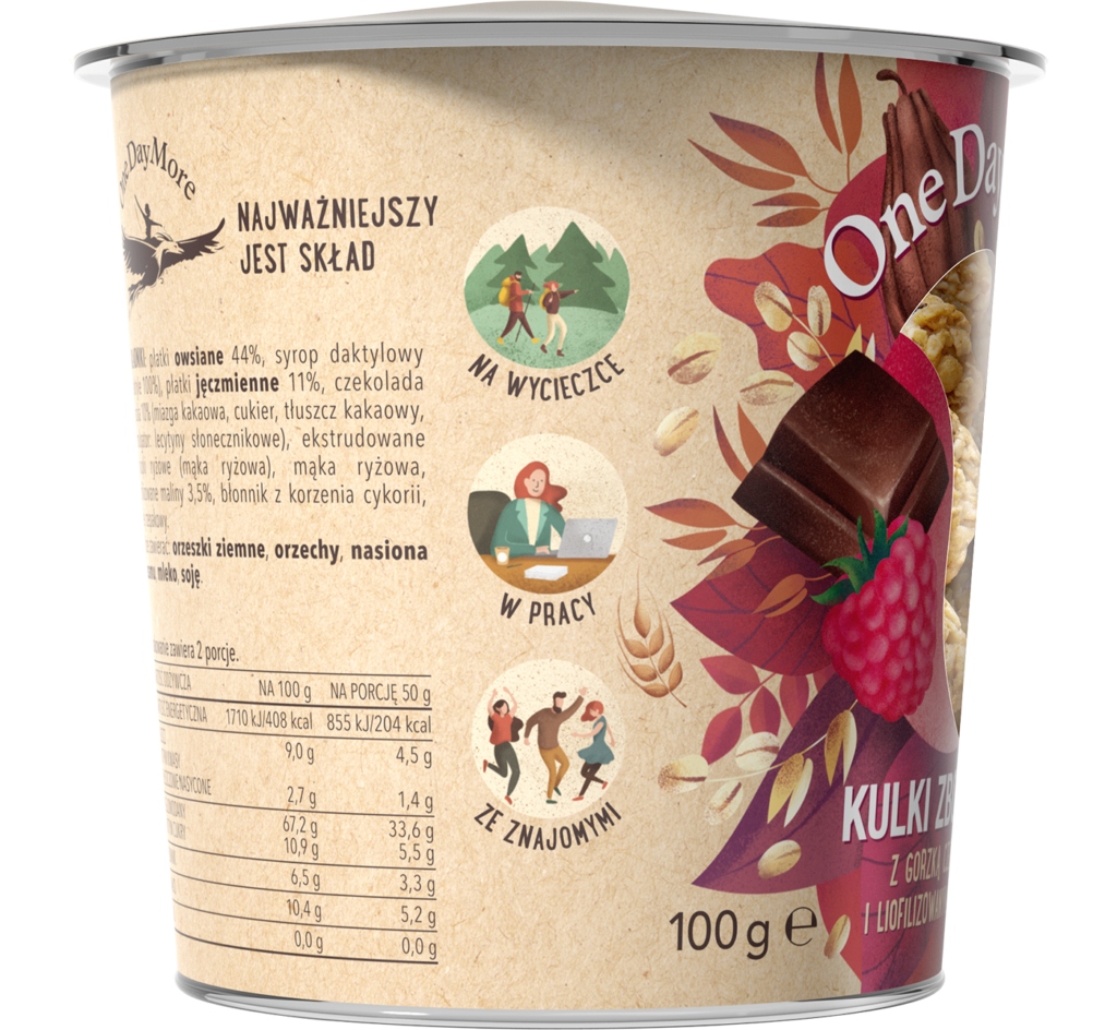 Темперамент темного шоколада и сладость малины - здесь может случиться только вкусное! Сделайте перерыв и выберите эту классическую комбинацию закусок прямо из природы. Шарики также содержат множество других натуральных ингредиентов: овсяные хлопья, финиковый сироп, волокна корня цикория и рапсовое масло. Мы запекаем их, пока они не станут хрустящими, чтобы каждый, кто тянется за ними, мог насладиться настоящим, питательным хрустом! Ставьте на натуральный, чистый состав без искусственных добавок и хрустите на здоровье!