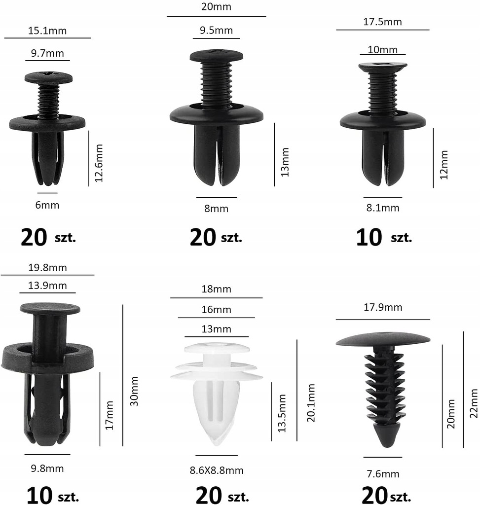 Комплект совместим с различными типами транспортных средств, позволяя крепить к автомобилю различные элементы. В комплект входят различные типы крепежных элементов, например, зажимы. , штифты, которые позволят прикрепить к автомобилю обивку, пластиковые элементы, бамперы.