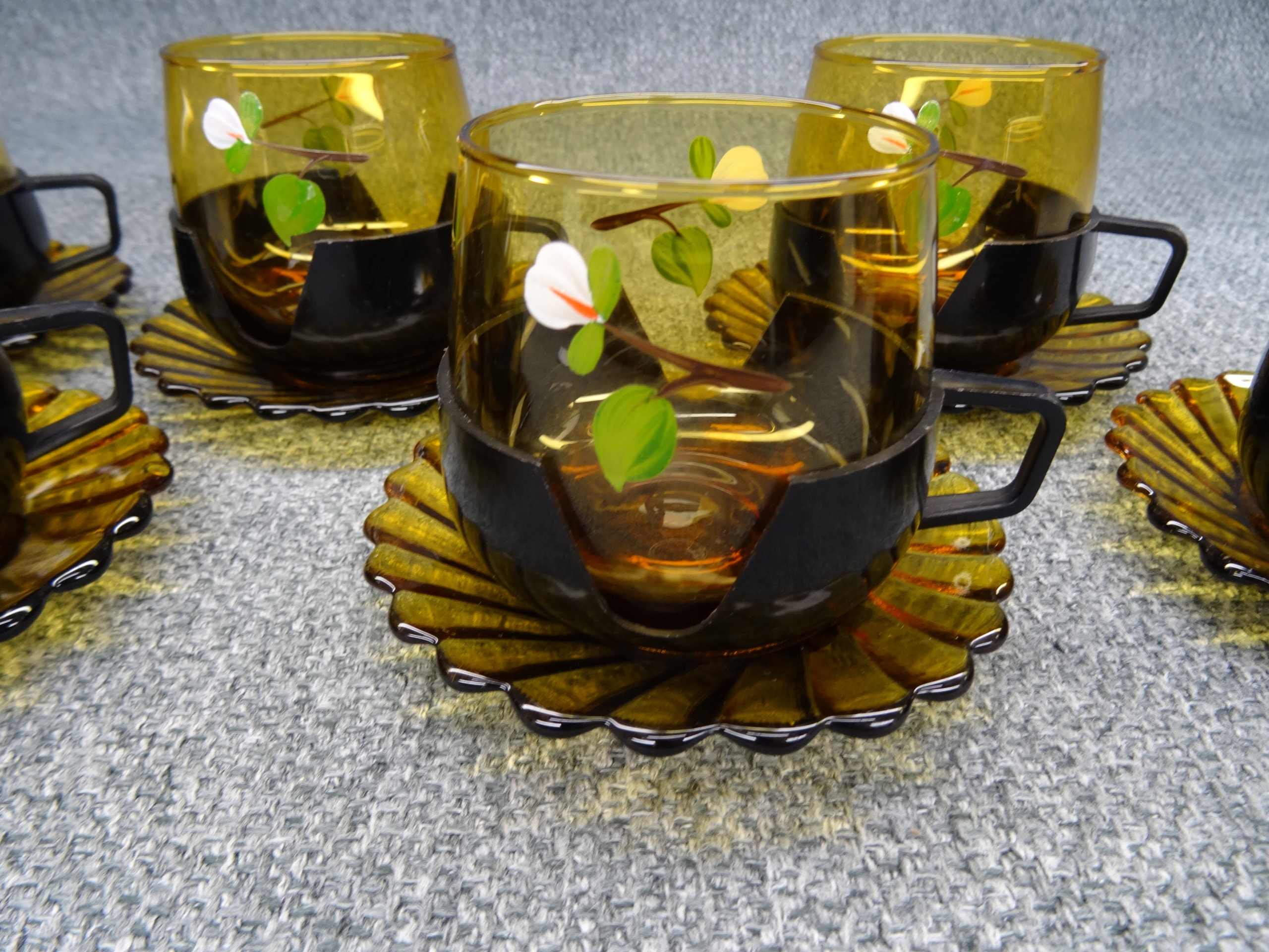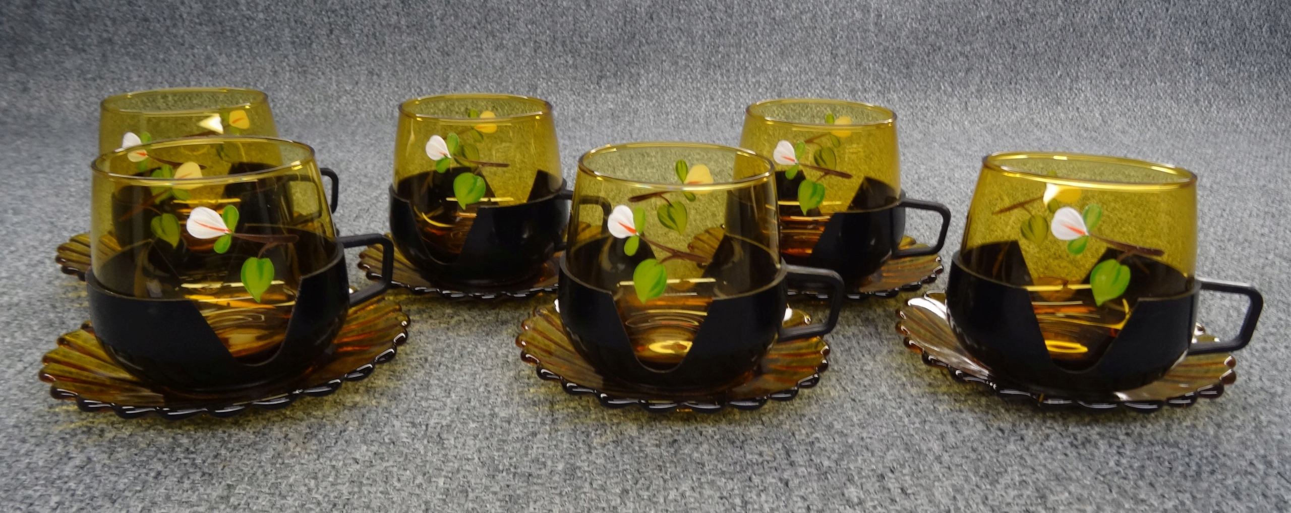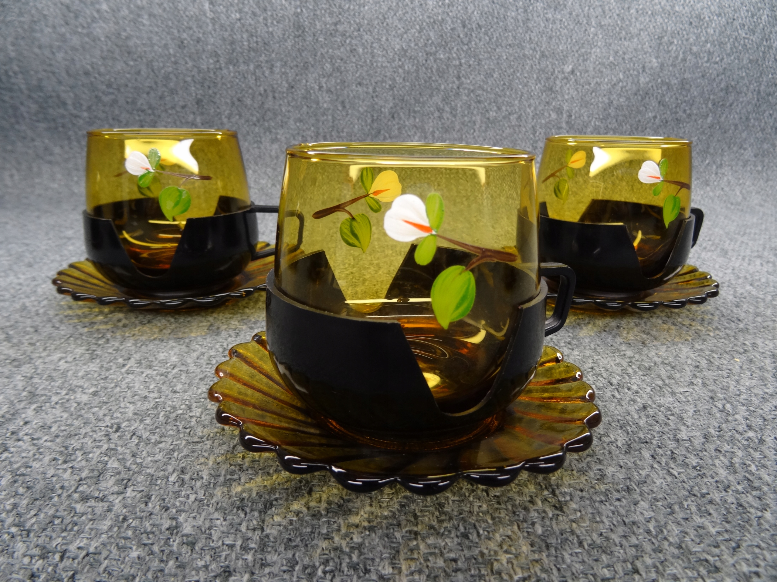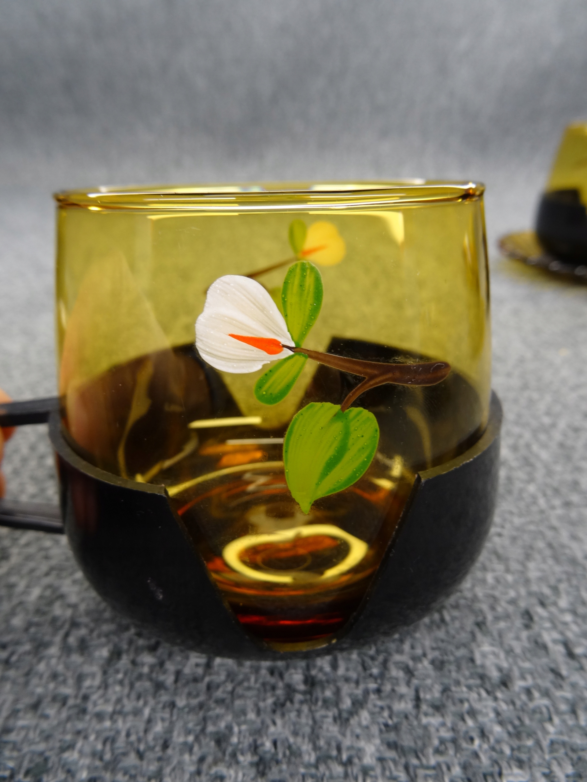 Zestaw 6 szt. szklanki w koszyczkach + 6 szt. podstawki malowane kwiaty