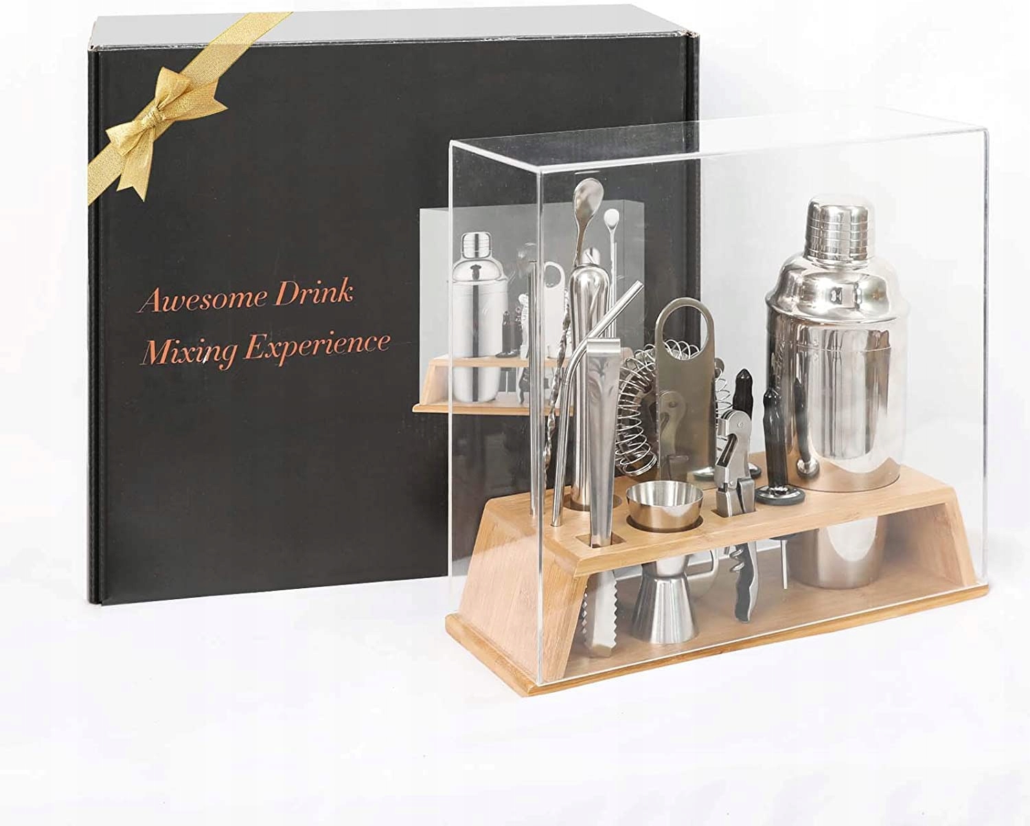 В комплект входят шейкер для коктейлей на 24 унции, щипцы для льда, штопор, 2 соломинки из нержавеющей стали, 2 носика для ликера, пестик, ситечко для коктейлей, 20 шт. /40 мл, открывалка для пива, ложка для смешивания, бамбуковая подставка, прозрачная крышка для бара и рецепты напитков. коктейли.