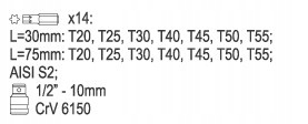 В комплект включает в себя: Torx 30 мм: T20, T25, T30, T40, T45, T50, T55 TORX 75 мм: T20, T25, T30, T40, T45, T50, T55 РЕКЛАМЕНТ 10 мм: 1/2 "