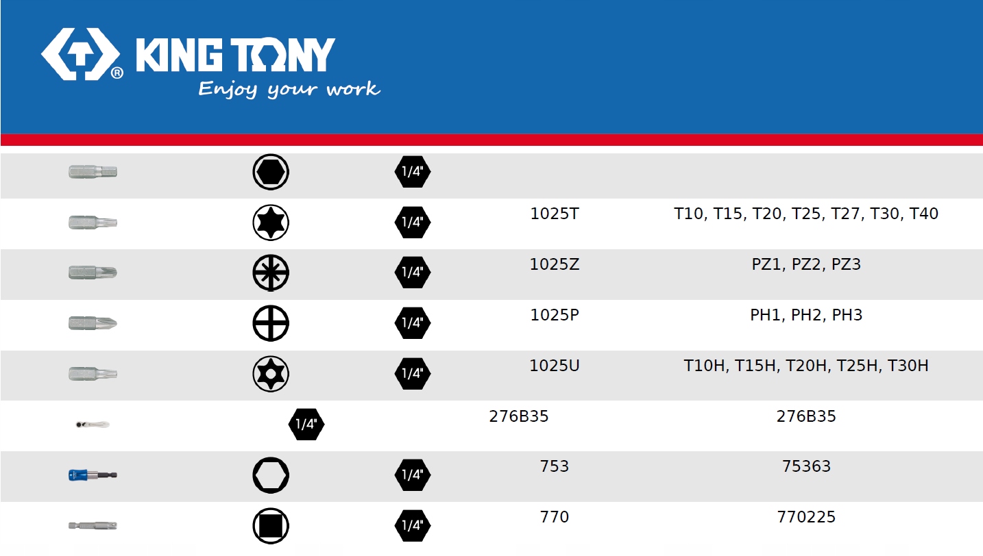 Компания KING TONY, благодаря использованию новейших технологий, японских патентов, материалов высочайшего качества и детальному контролю производственного процесса, получает профессиональную продукцию, долговечность которой значительно превышает требования международных стандартов DIN (Германия) и ANSI (США). Корпорация развивается очень динамично, постоянно расширяет ассортимент предлагаемой продукции, ищет новые и лучшие решения и внимательно следит за потребностями постоянно растущего числа клиентов.