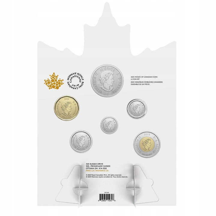Набор из 6 монет 2023 года «Канада: Мозаика канадских икон» — интересный продукт, который служит гордым выражением канадской идентичности в 2023 году. В наборе представлена эксклюзивная монета номиналом 50 центов, созданная Алишей Жиру, с канадскими значками, образующими красочную мозаику.