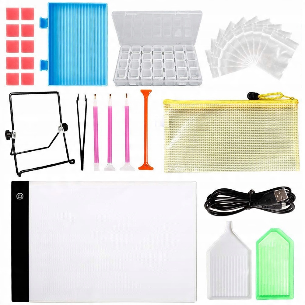 Планшет со светодиодной подсветкой формата А4 поставляется с USB-кабелем и регулируемой подсветкой, которую можно подключить к источнику света. Он стал очень полезным при подсветке в очень темной системе рисования бисером, так что вы можете использовать его в цифрах.