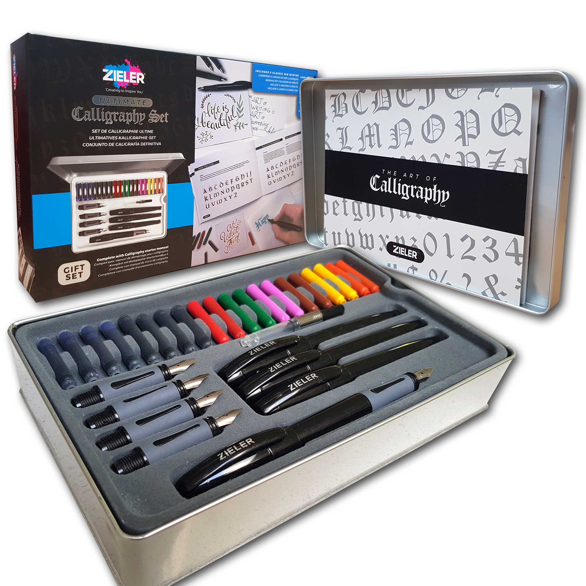 Набор для каллиграфии Zieler — идеальная идея подарка для людей, начинающих свое приключение в каллиграфии. С помощью этого набора вы освоите каллиграфию такими шрифтами, как Italic, Uncial, Roman Round Hand и т. д. Каллиграфия ручной работы незаменима на свадебных приглашениях и в других случаях, в письмах, открытках, в качестве дополнения к ежедневнику, календарю или в иллюстрациях. .