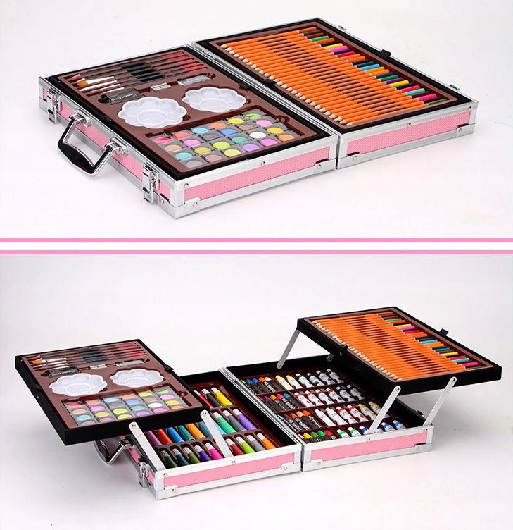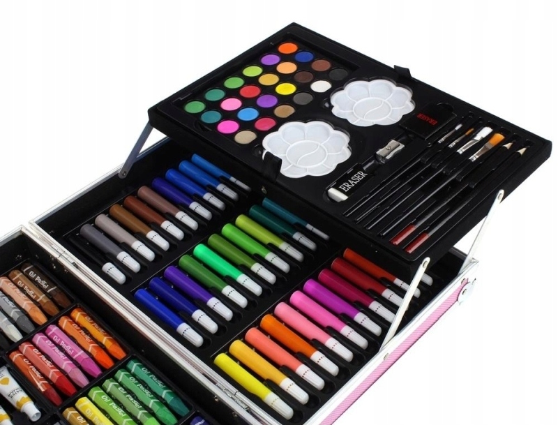 Набор для рисования и рисования помещен в специальный футляр – алюминиевый чемодан. . Имеет рельефные отделения для мелков, фломастеров, красок и аксессуаров. Состоит из четырех частей, боковые представляют собой приподнятые полки, обеспечивающие лучший доступ к содержимому.