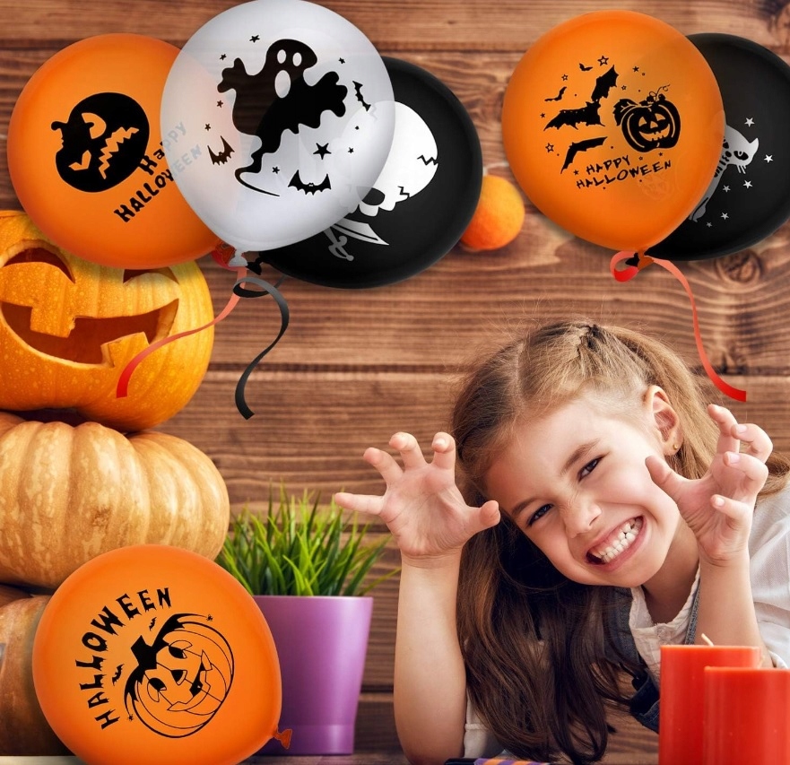 - Шарики MIX чёрные, оранжевые, чёрные с принтамиМотив Хэллоуин 10 шт. (30см)