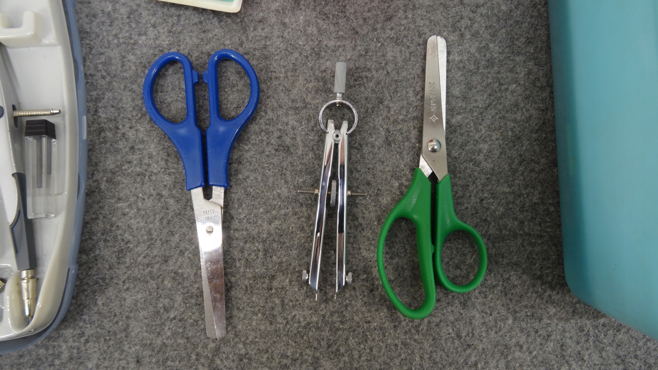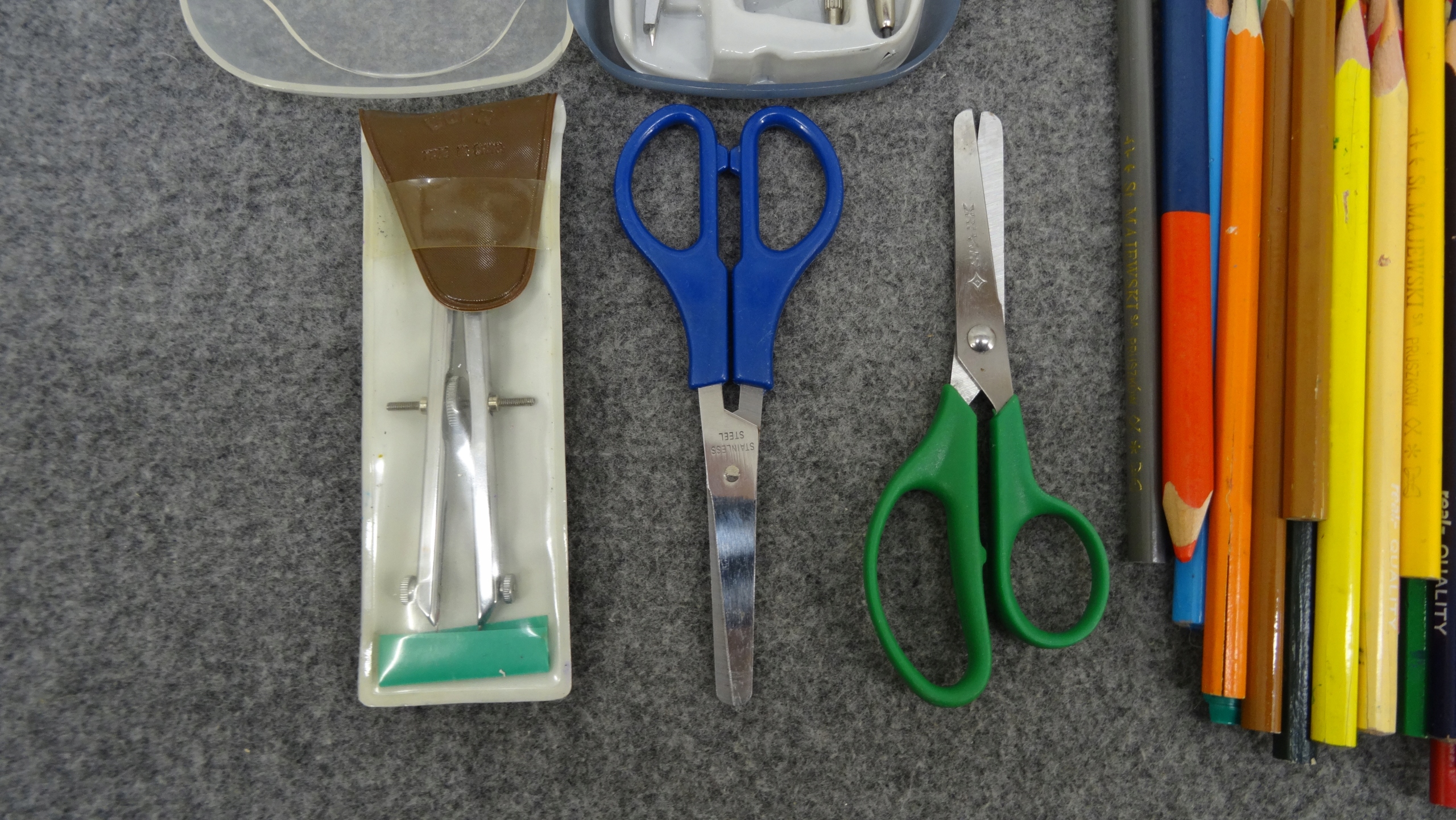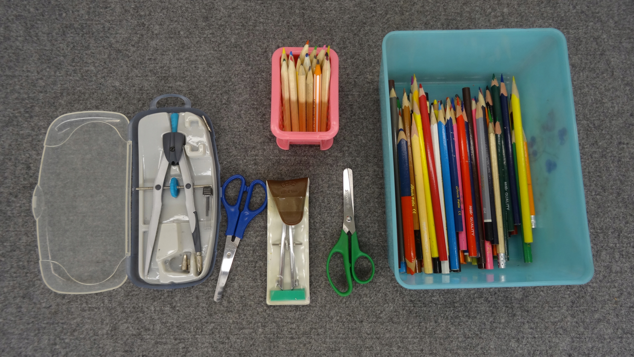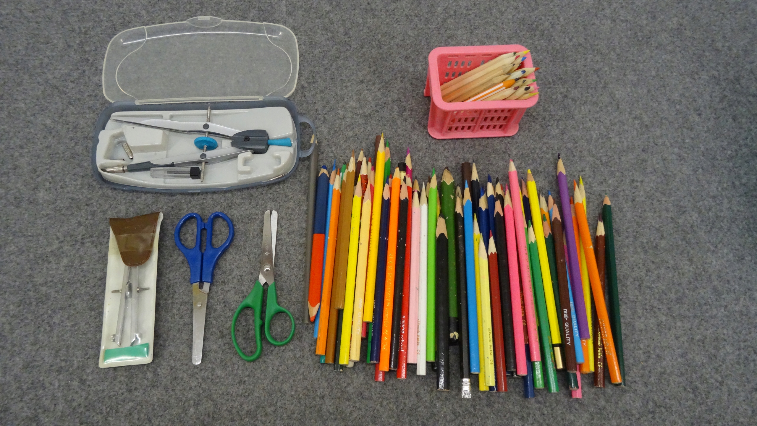 Zestaw: kolorowe kredki, nożyczki, cyrkle