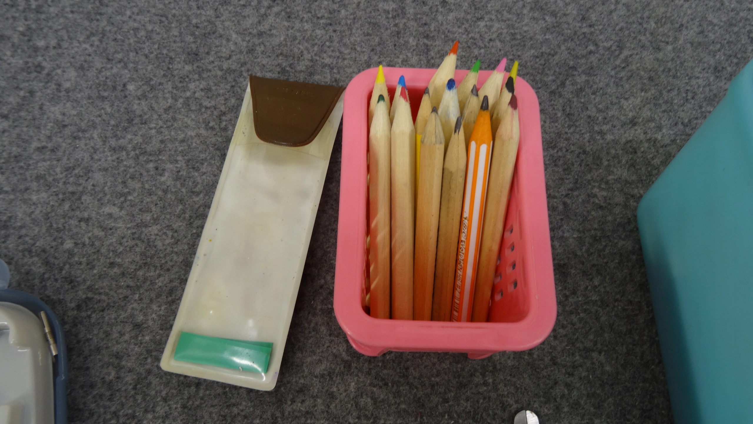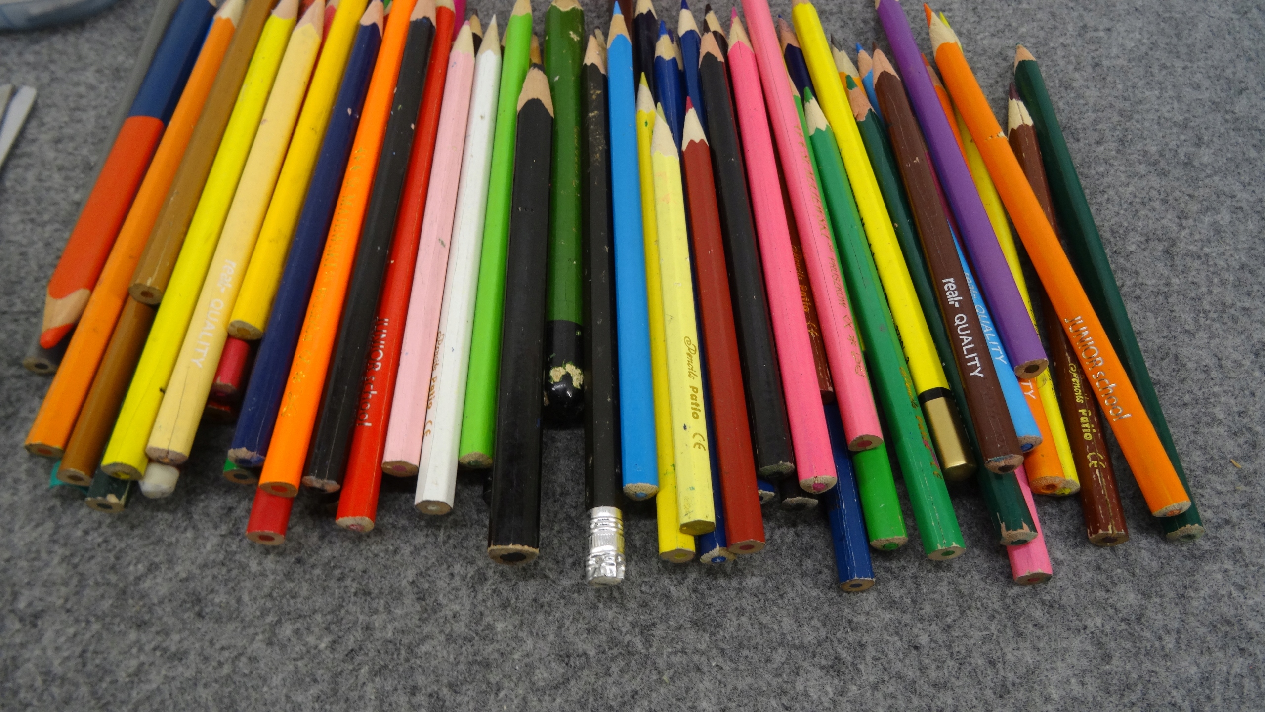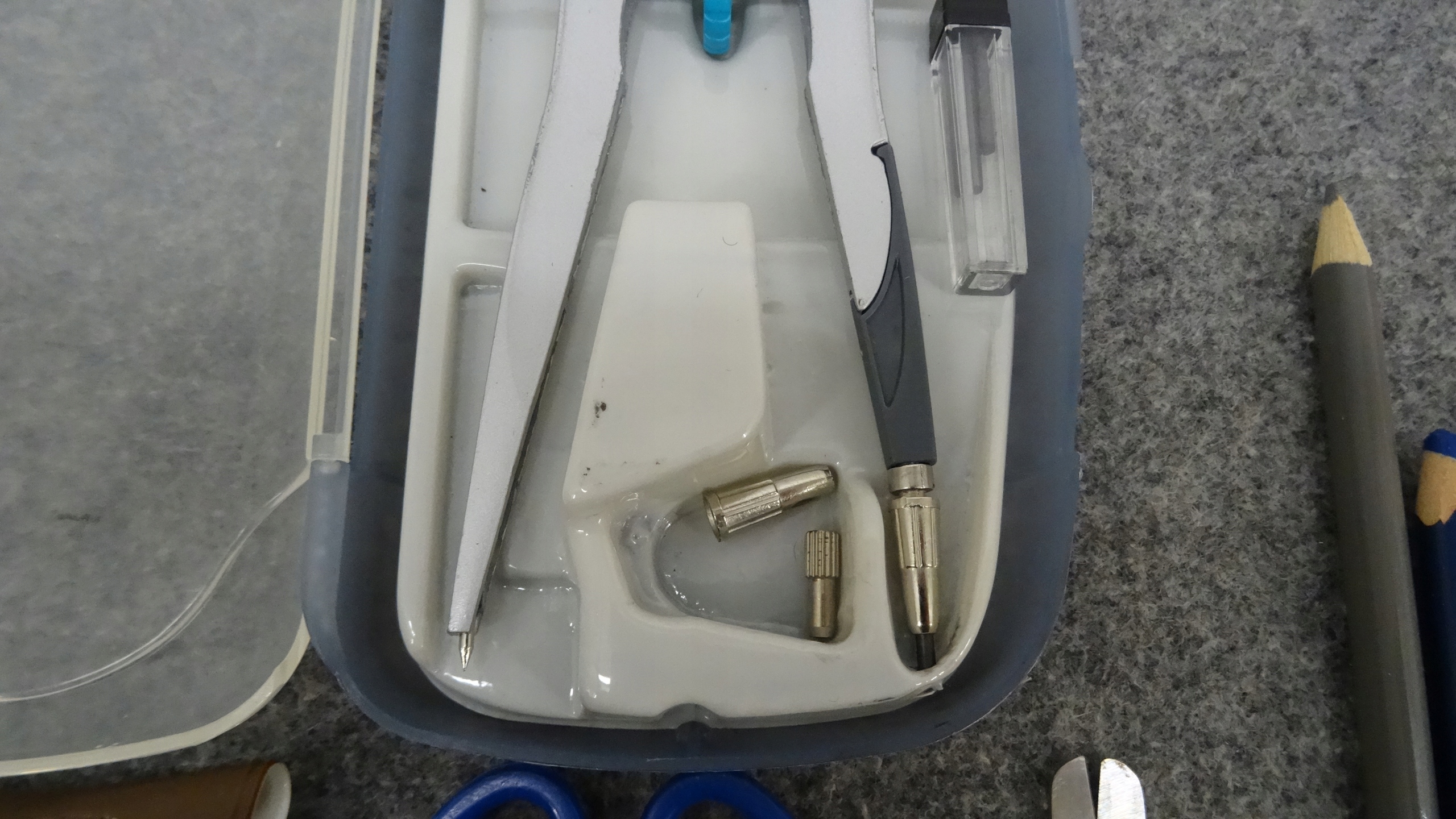 Zestaw: kolorowe kredki, nożyczki, cyrkle
