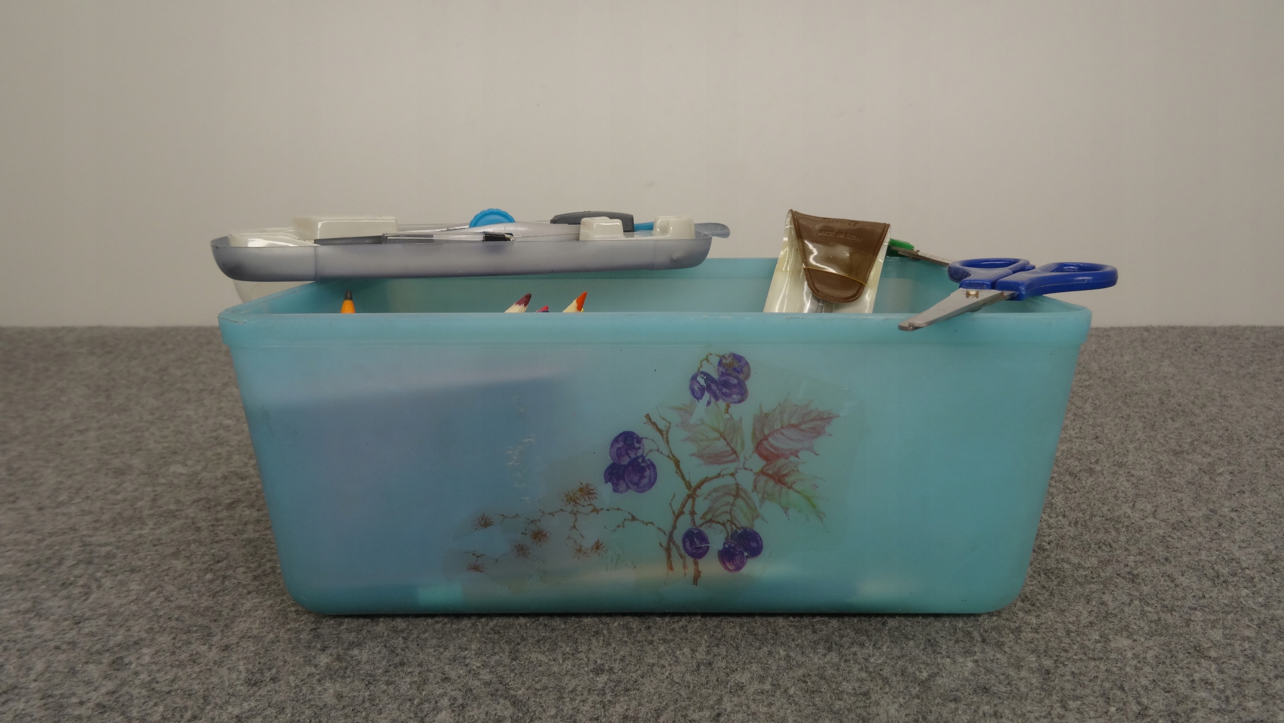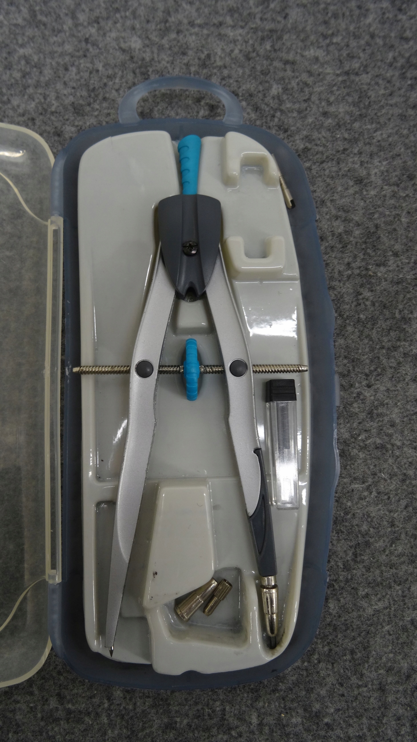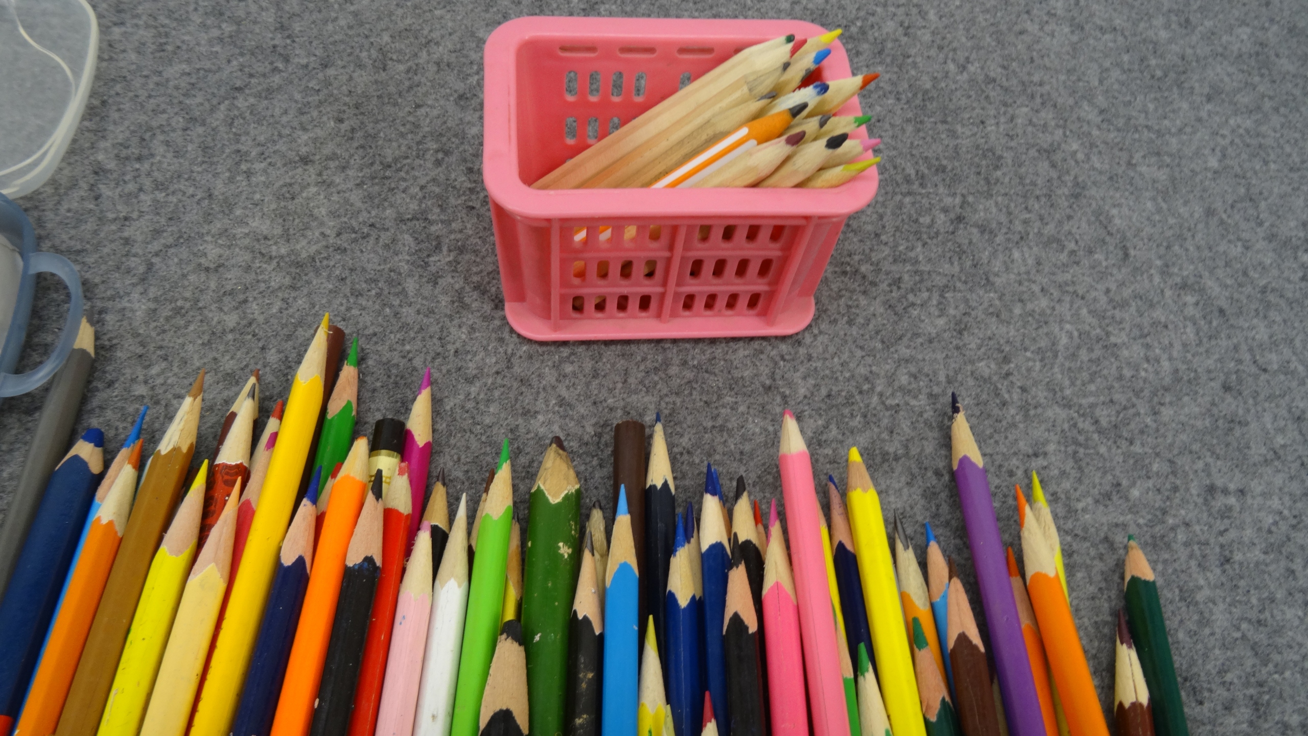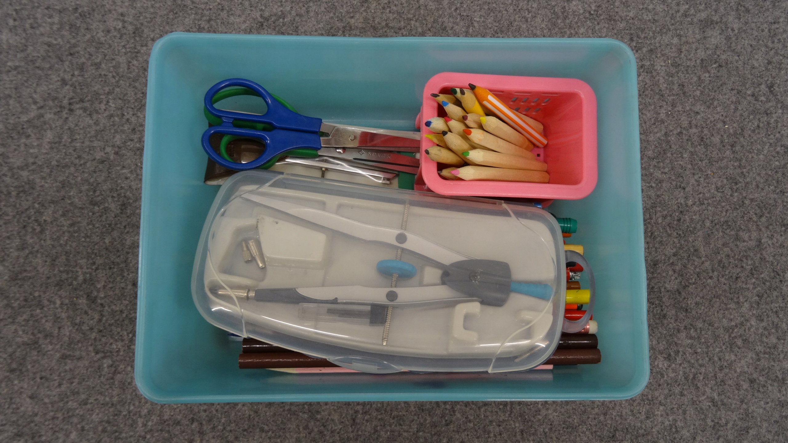 Zestaw: kolorowe kredki, nożyczki, cyrkle