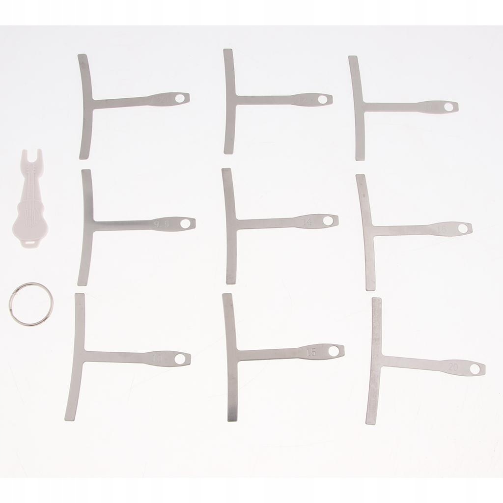 В комплект входят 9 калибров накладок грифа, 1 съемник кеглей, 1 линейка калибра струн, 2 крышки ладов