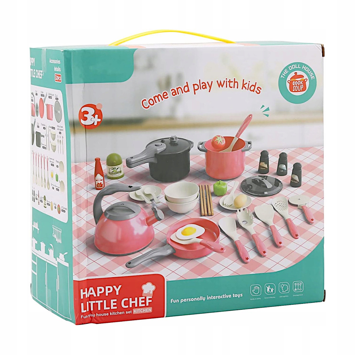 Симпатичный набор кастрюль, который идеально подойдет для кухни маленького повара, развивая его навыки ручного труда и позволяя ему готовить множество различных блюд. Он оснащен набором кастрюль со съемными крышками и сковородой с крышкой. У чайника также есть съемная крышка и подвижный свисток, благодаря которому вы можете наполнить его водой. Приготовление облегчит входящая в комплект кухонная утварь, например, ложка для макарон или лопатка для сковороды. В набор также входят основные специи и ингредиенты для блюд, которые разнообразят удовольствие. Готовые блюда можно подавать на тарелках и мисках, входящих в комплект.