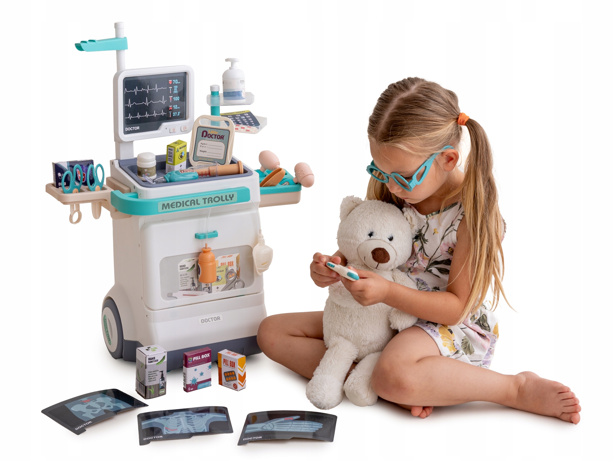 Интерактивный, богато оснащенный набор врача с медицинской тележкой и аксессуарами - предложение для детей от 3 лет. возраст. С этим набором ребенок сможет сыграть роль офтальмолога, терапевта, кардиолога или стоматолога. Большая медицинская тележка, на которой мы можем разместить все медицинские принадлежности, легка и ее легко передвигать благодаря двум гладким и большие колеса и удобная ручка. Имеет интерактивные звуковые и световые эффекты, что добавляет изделию привлекательности.