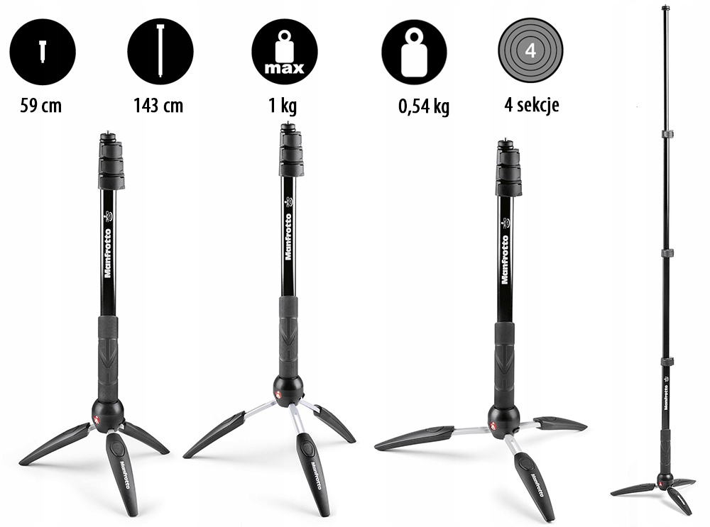 Комплект Manfrotto PIXI EVO предназначен для поддержки небольших камер с обзором 360°. В комплект входит специально адаптированная версия PIXI EVO и 4-секционная алюминиевая стойка с винтом 1/4 дюйма для крепления камеры.