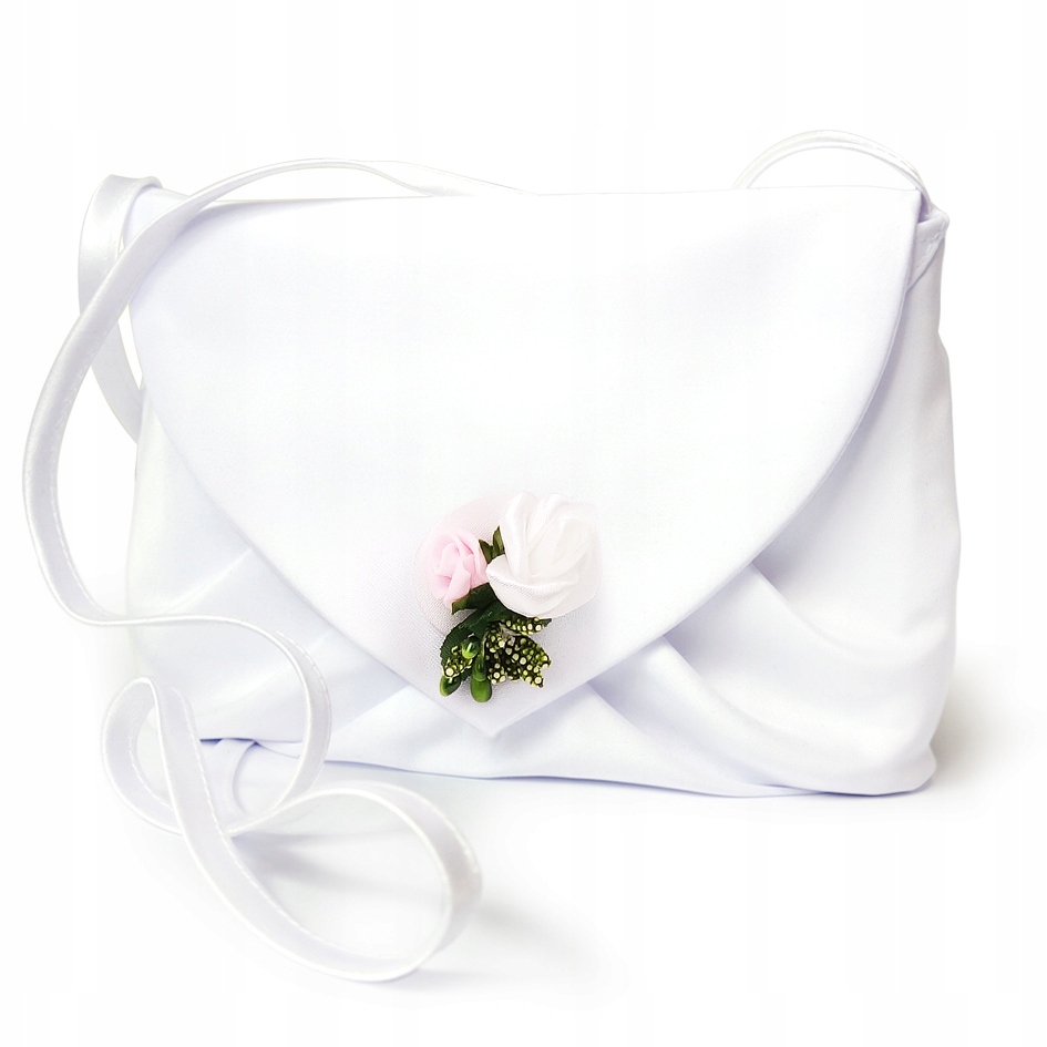 Сумочка с булавкой-цветком – практичное дополнение наряда девушки в день Первого Причастия. Она сможет положить в сумочку молитвослов, четки и другие самые необходимые вещи. Сумка изготовлена из белой ткани в форме классического клатча с декоративными складками. Застежка-липучка сумки. Сумка оснащена длинным атласным ремнем через плечо. На клапане сумки имеется изящная булавка с цветком, которая удачно сочетается со всем комплектом. Булавка представляет собой композицию из двух роз - розовой и белой с зеленой добавкой. Он изготовлен из искусственных материалов и тканей. Прекрасно сочетается с венком, вместе с которым сумка с таким декором создает единое целое, полное тонкого девичьего очарования.
