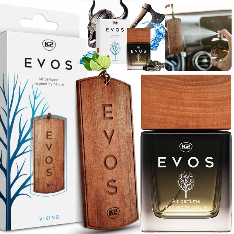 ZESTAW NA PREZENT K2 EVOS VIKING perfumy do auta,zawieszka drewniana+flakon