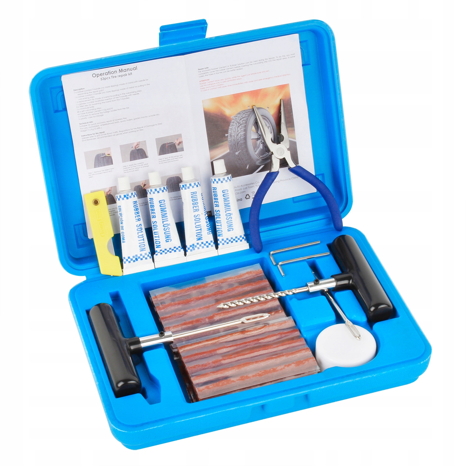 Комплект для ремонта автомобильных шин. В небольшом чемоданчике находится набор прочных элементов для необходимого ремонта.