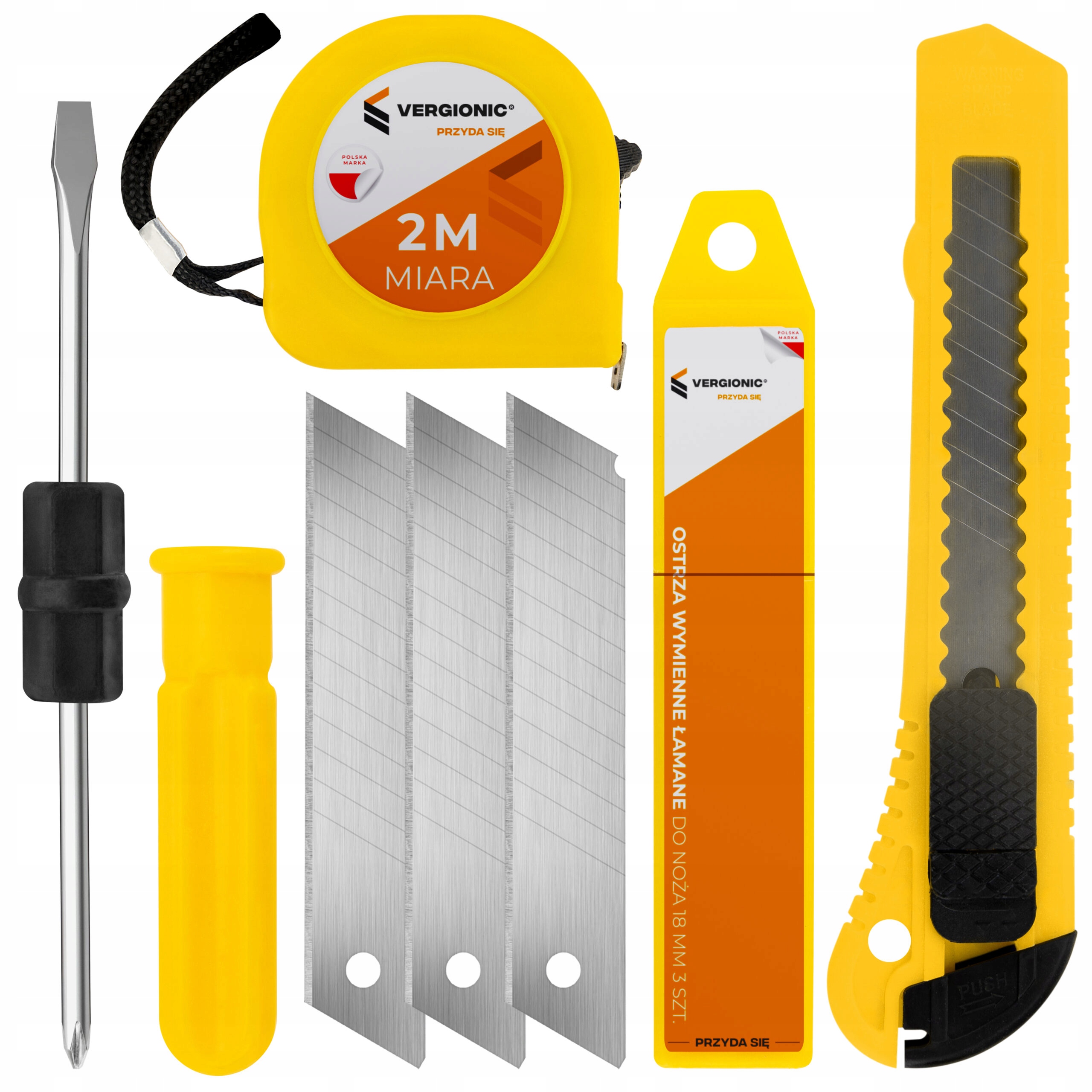 ZESTAW NARZĘDZI NÓŻ NOŻYK TAPECIAK MIARA OSTRZA WKŁADY ŚRUBOKRĘT 4el