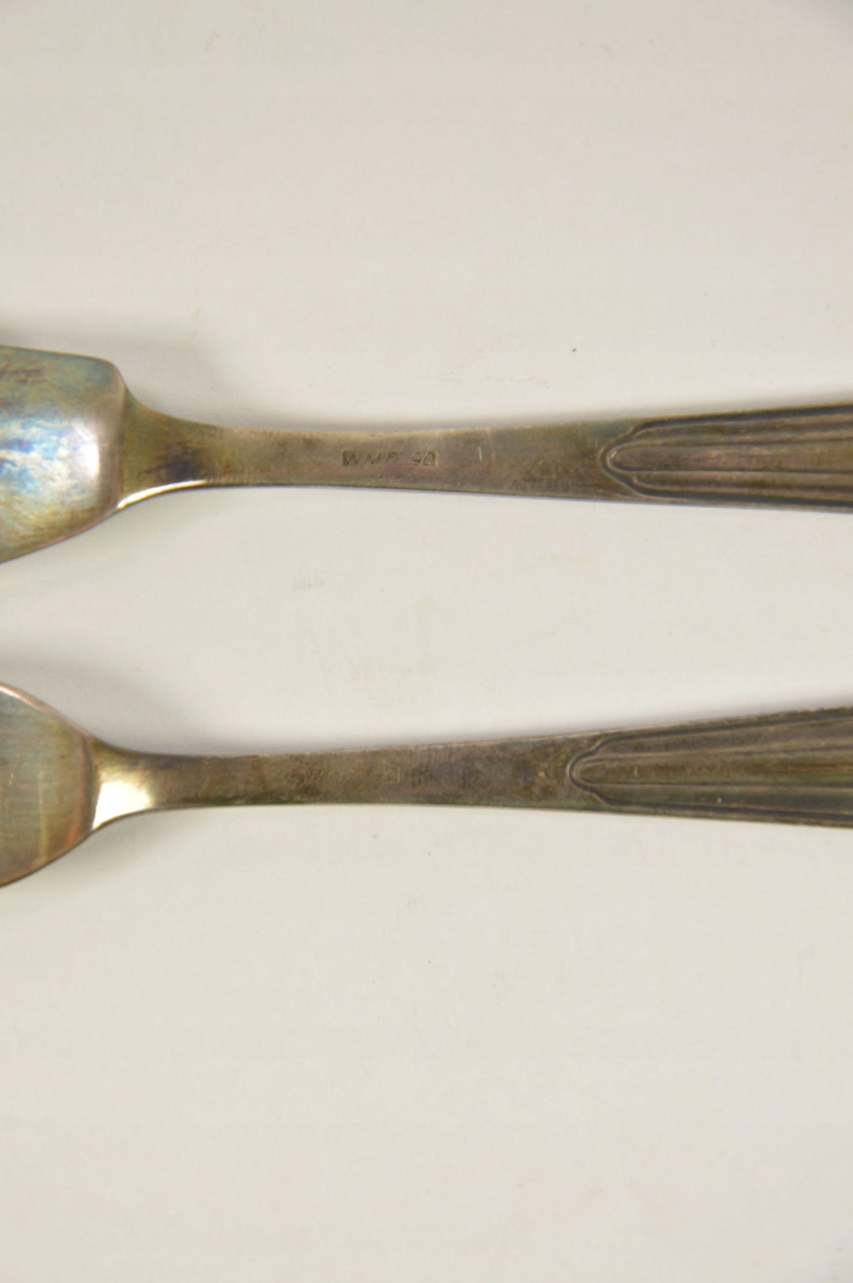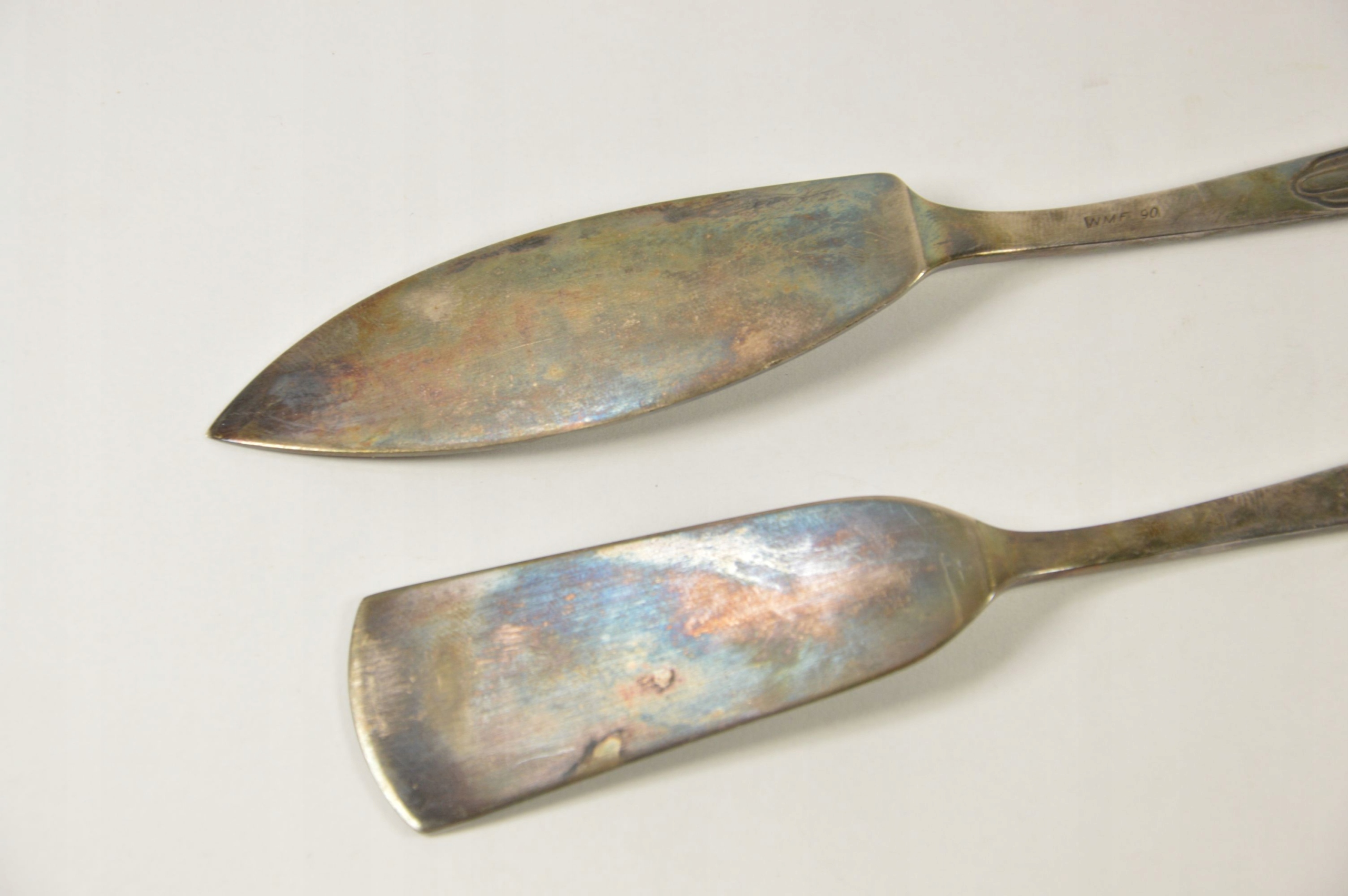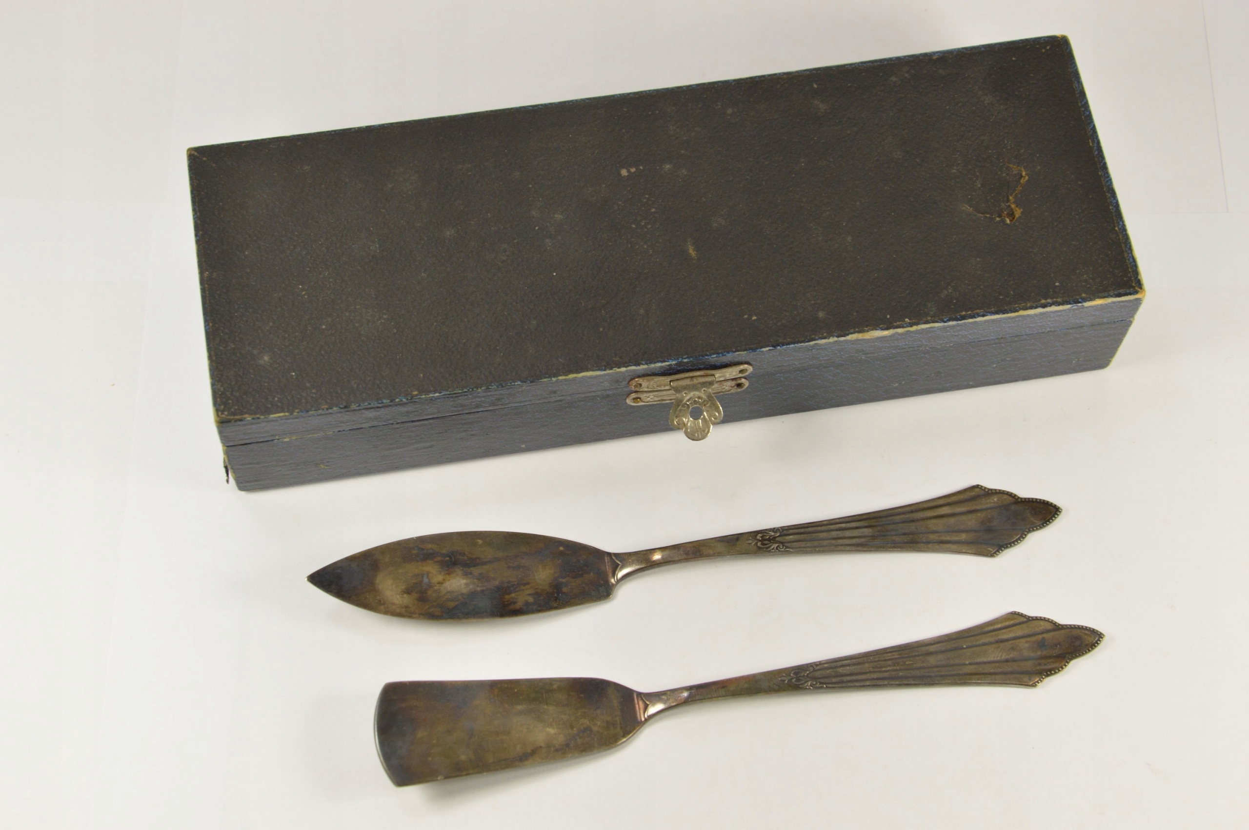 Набор ножей для сыра и масла в стиле WMF. Позолоченные ножи, очень хорошей сохранности, покрыты натуральной благородной патиной. В комплекте оригинальный футляр.