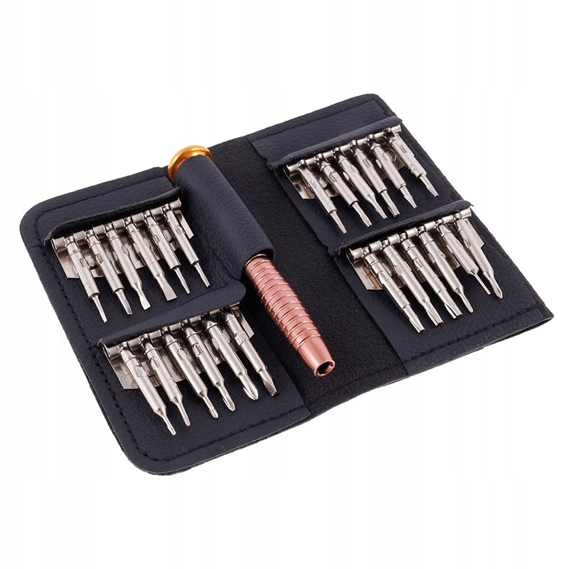Набор, позволяющий обслуживать и ремонтировать большинство небольших устройств. Отвертки подходят ко всем винтам и винтам, используемым в электронных устройствах. Каждая из 24 насадок прикреплена к специальному держателю, который предотвращает их выпадение. Чтобы снять насадку, отогните фиксирующий ремень и переместите крышку на 180°, пока головка не окажется в более широкой части держателя и не выдвинется свободно.