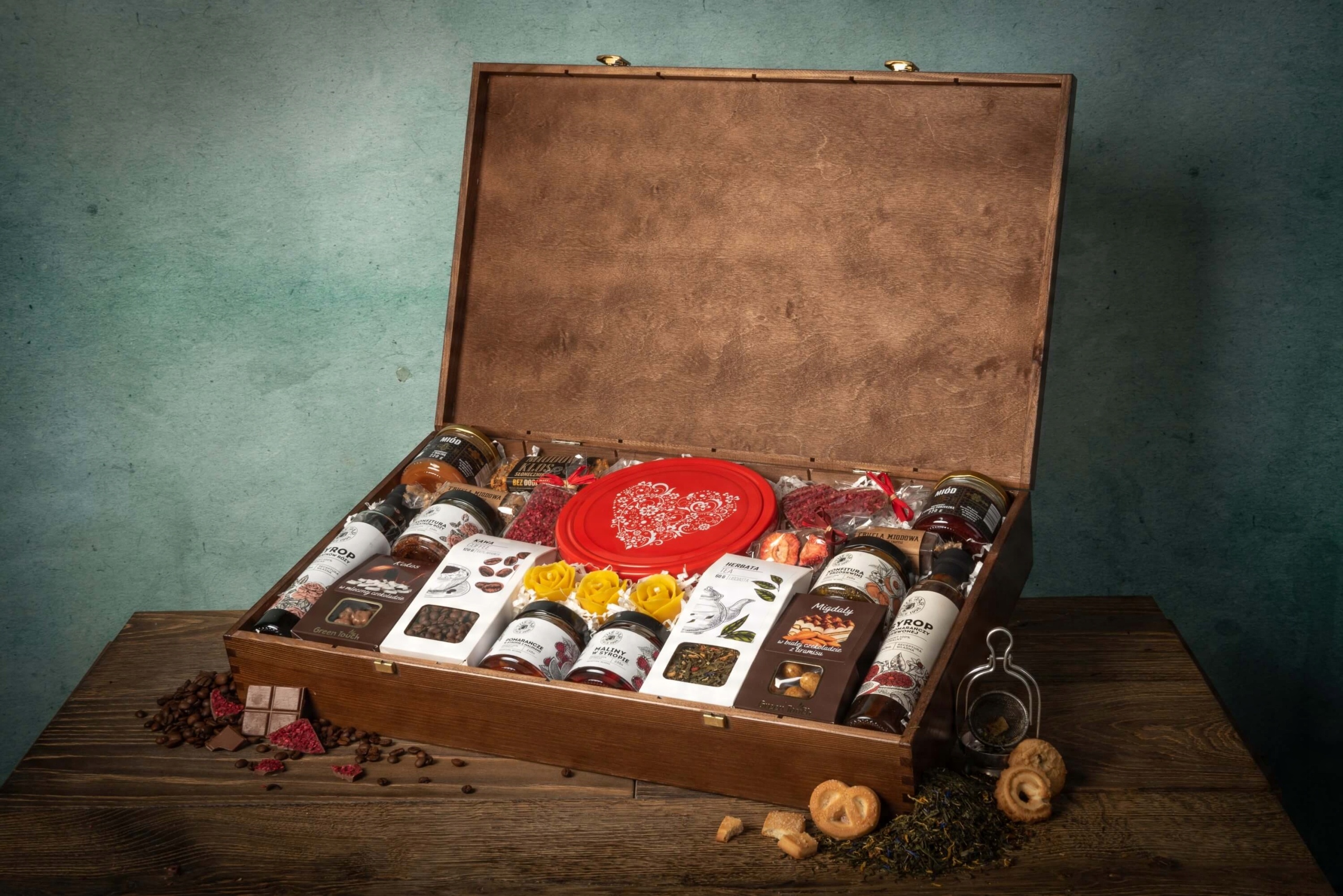 Zestaw prezentowy duża skrzynka 22 produkty herbata kawa miód przetwory