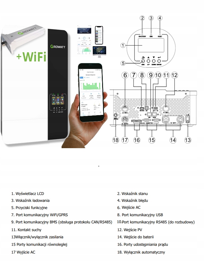 - Беспроводной WiFi-мониторинг островных инверторов Growatt серии SPF.