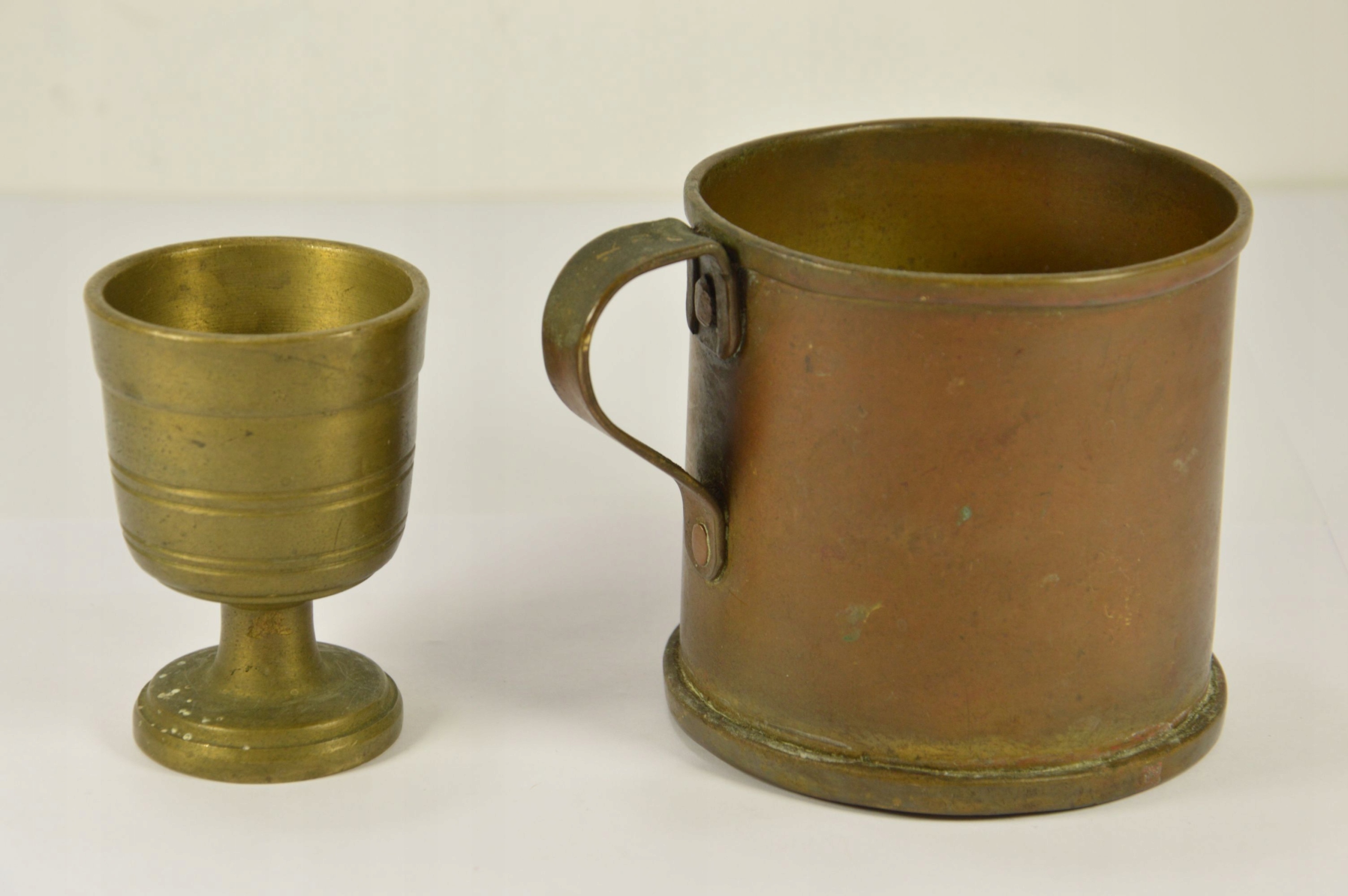 Интересный набор из матросской кружки и кубка. Оба изготовлены из латуни, без повреждений, с видимыми легкими следами использования.