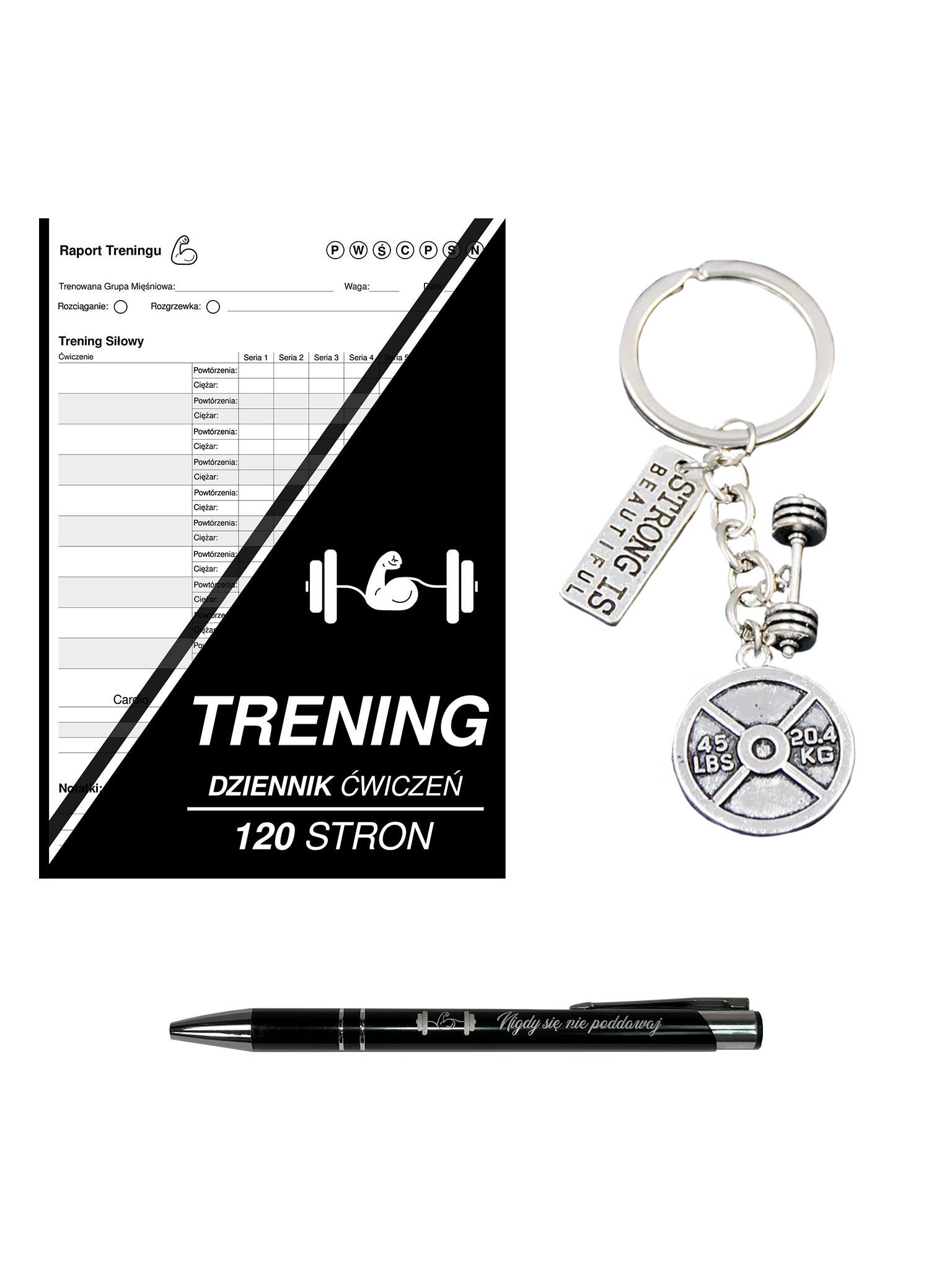 Zeszyt notes treningowy + brelok hantel talerz napis + długopis czarny